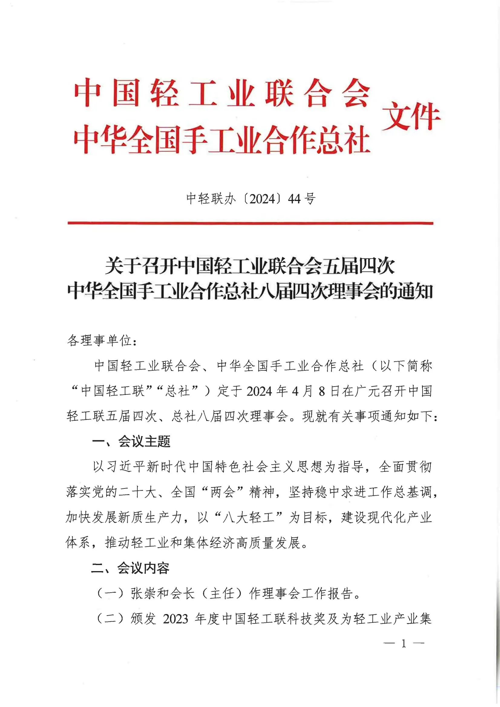 關(guān)于召開中國(guó)輕工業(yè)聯(lián)合會(huì)五屆四次 中華全國(guó)手工業(yè)合作總社八屆四次理事會(huì)的通知