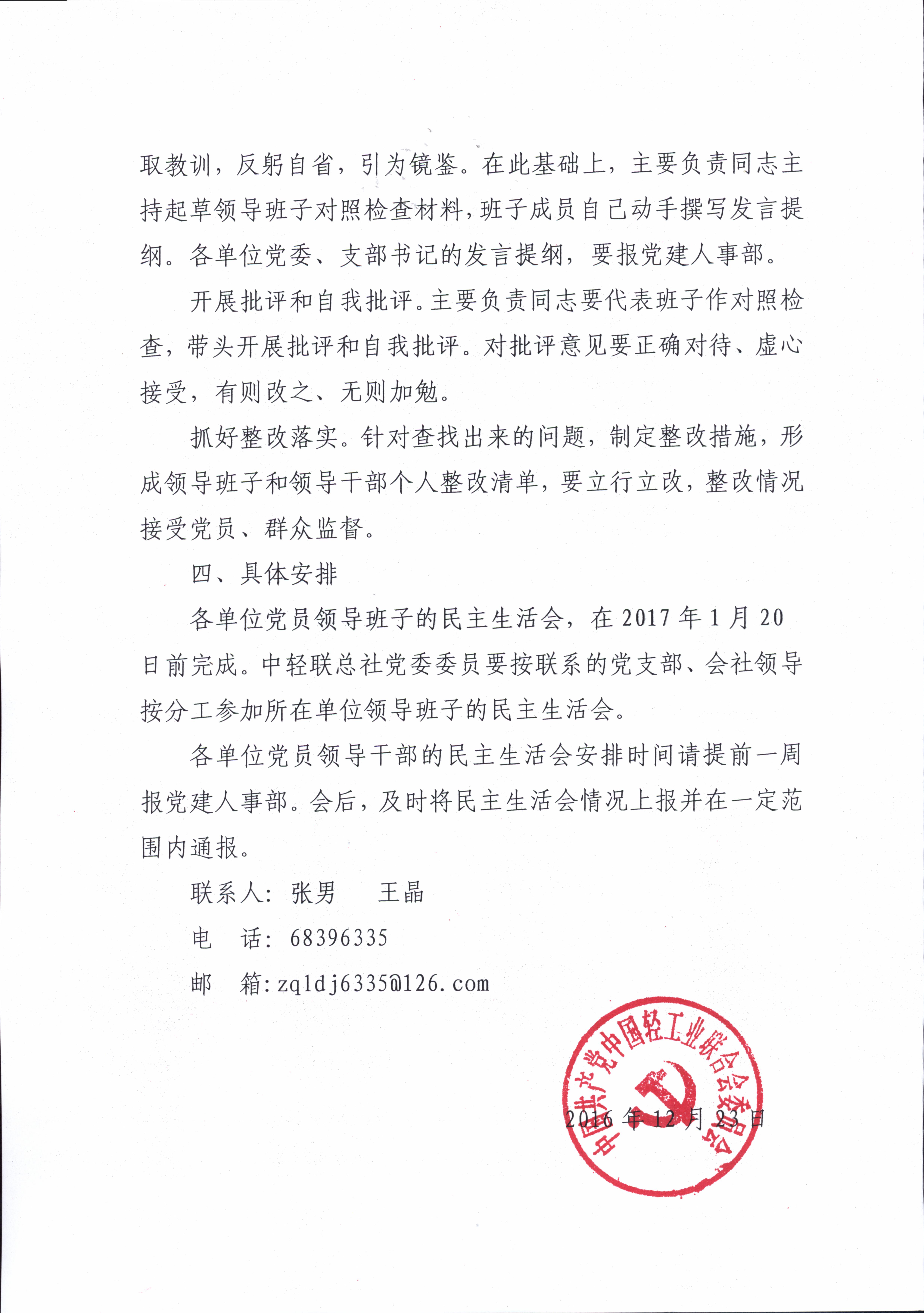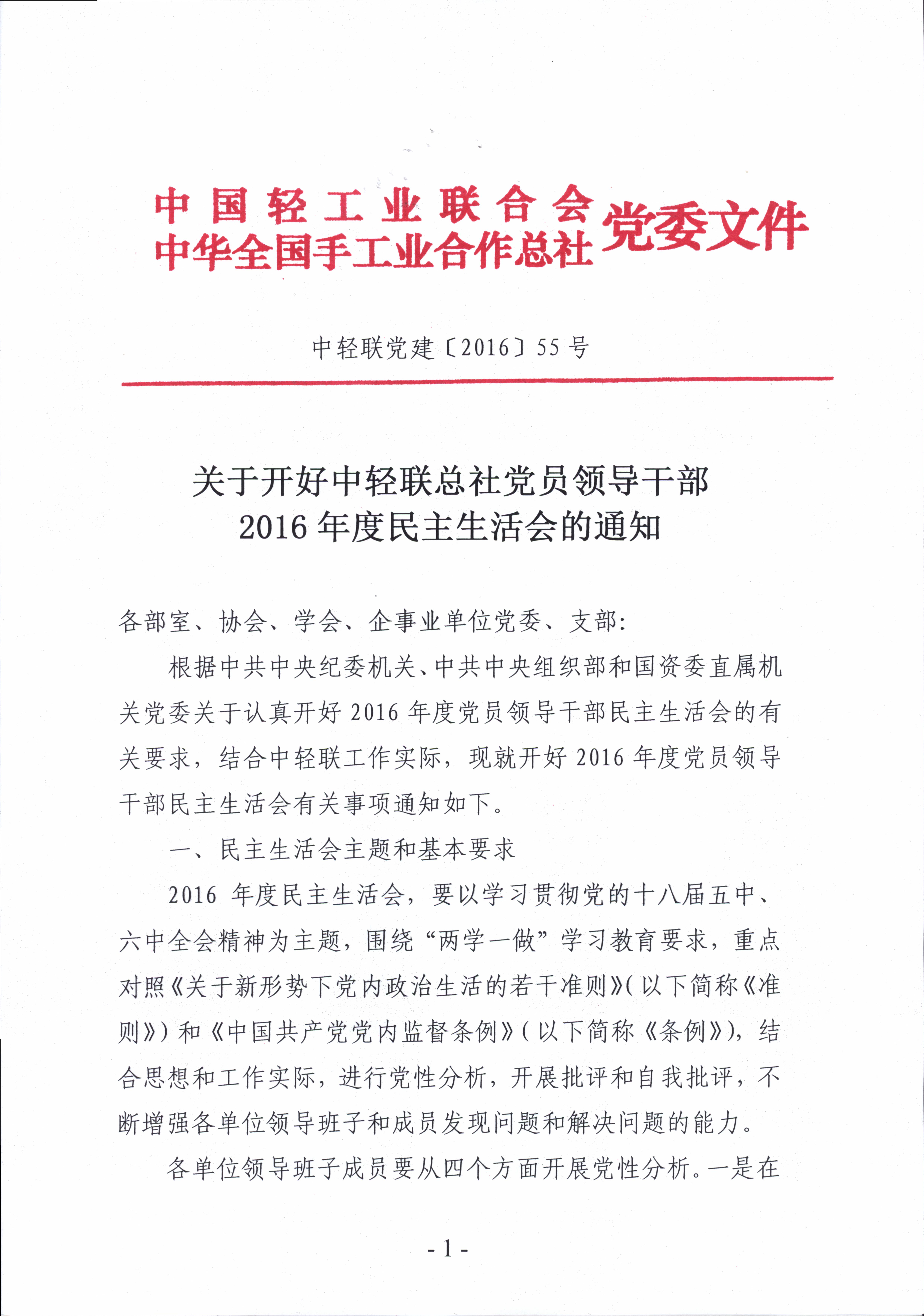 關(guān)于開好中輕聯(lián)總社黨員領(lǐng)導(dǎo)干部2016年度民主生活會(huì)的通知