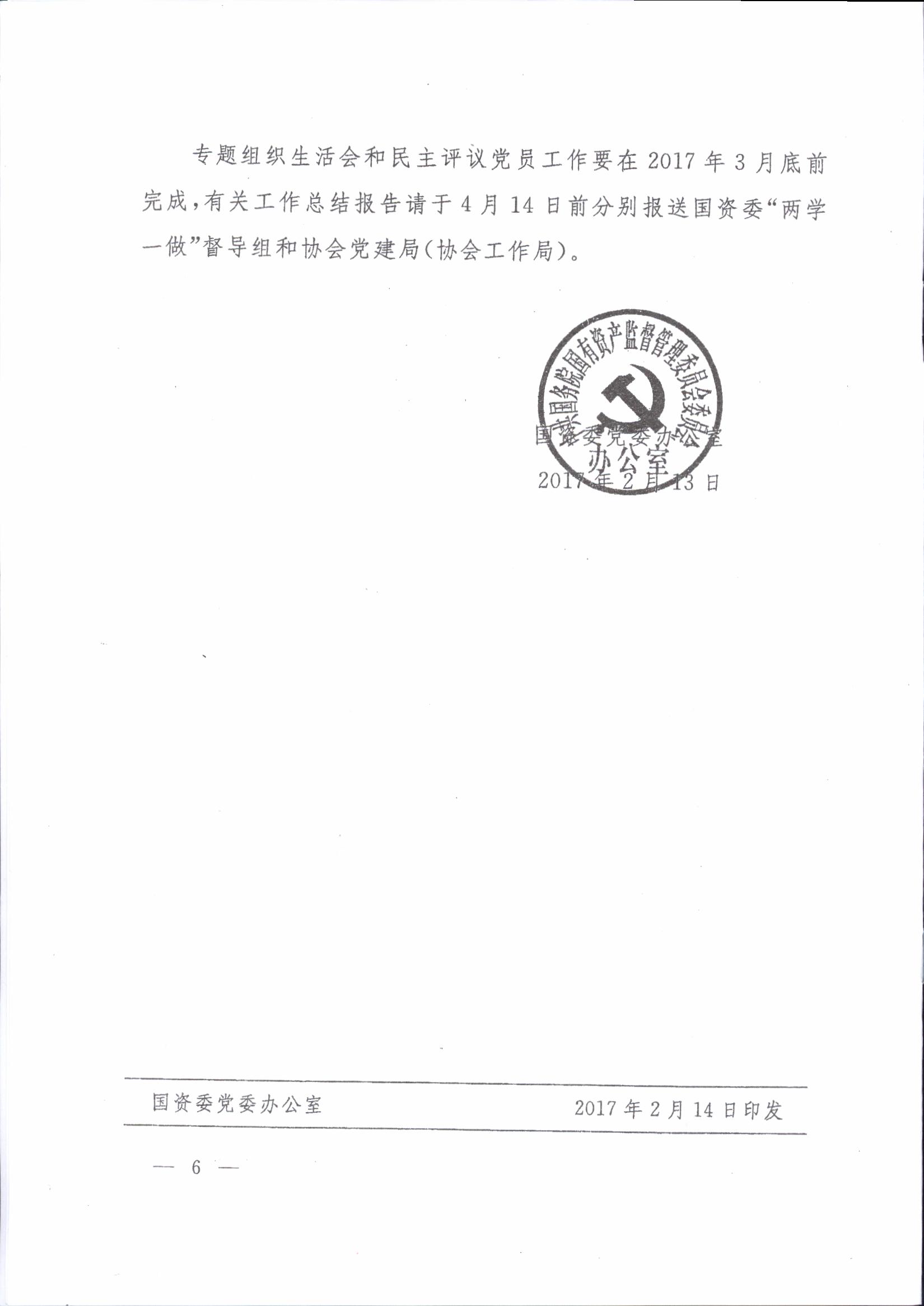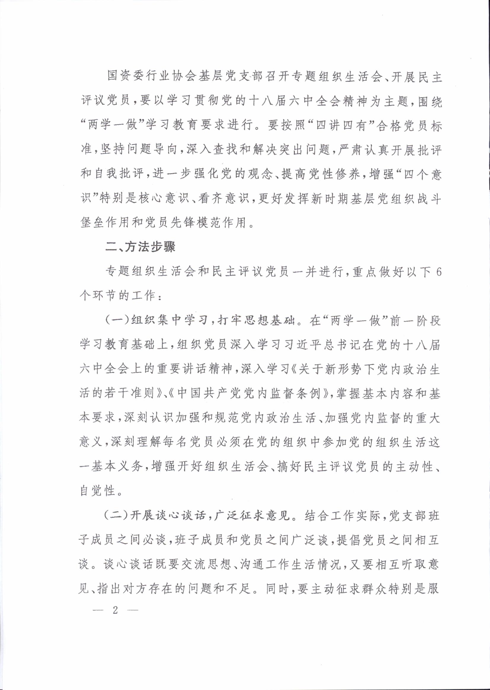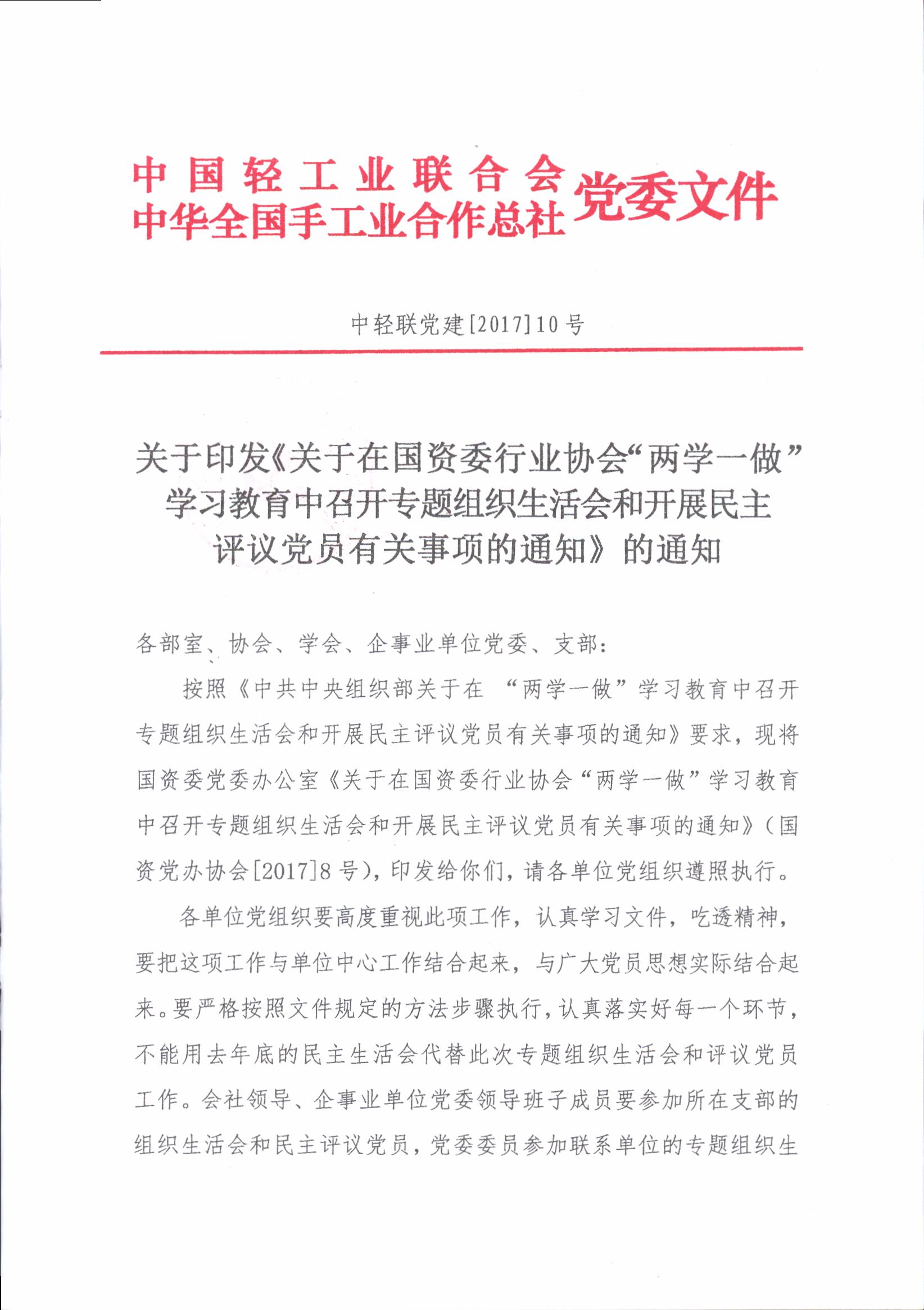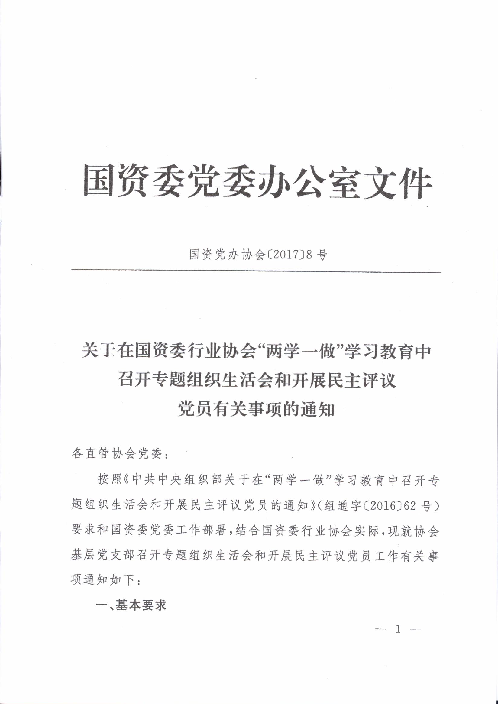 關(guān)于印發(fā)《關(guān)于在國(guó)資委行業(yè)協(xié)會(huì)“兩學(xué)一做”學(xué)習(xí)教育中召開(kāi)專(zhuān)題組織生活會(huì)和開(kāi)展民主評(píng)議黨員有關(guān)事項(xiàng)的通知》的通知