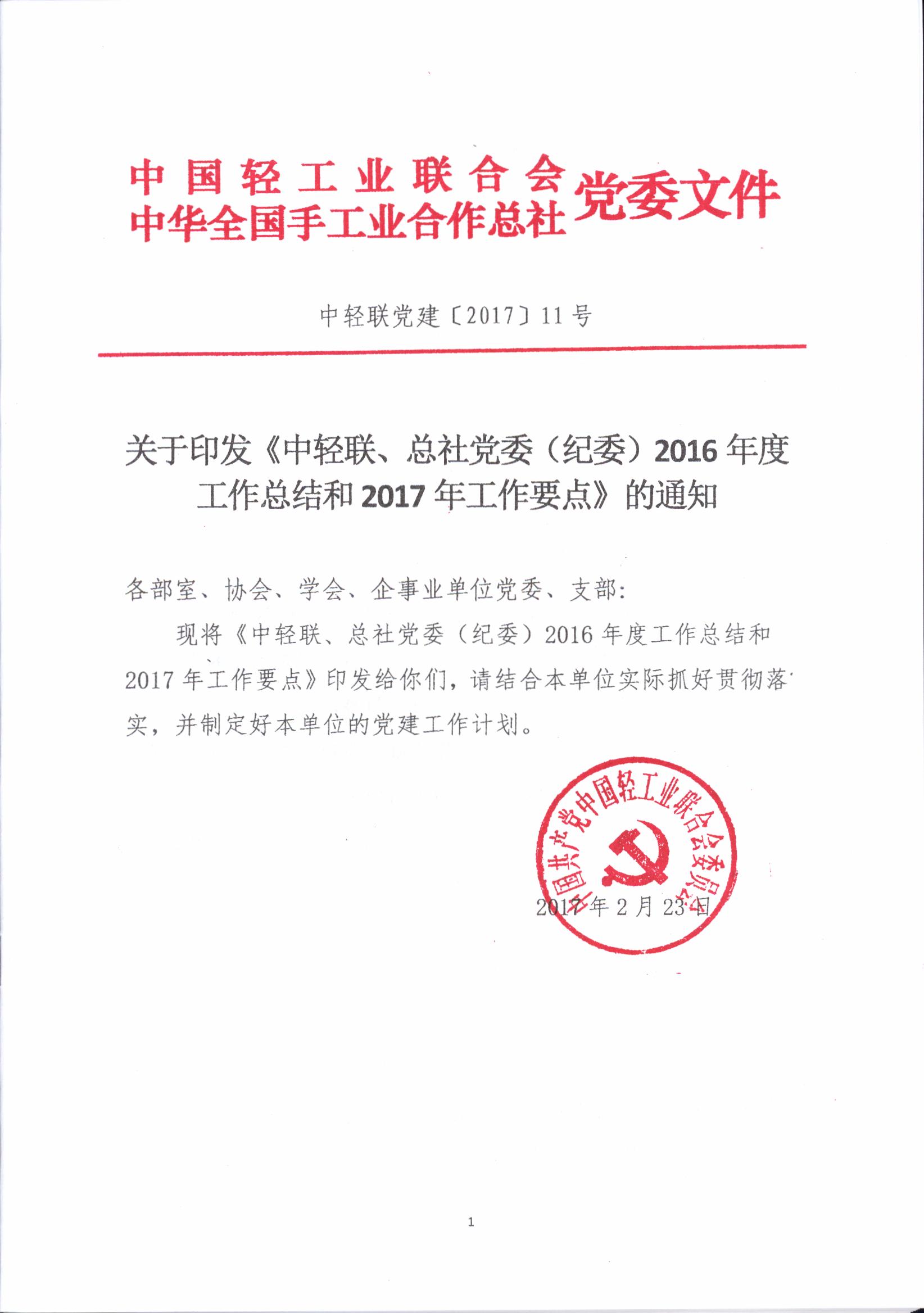 關(guān)于印發(fā)《中輕聯(lián)、總社黨委(紀(jì)委)2016年度工作總結(jié)和2017年工作要點》的通知