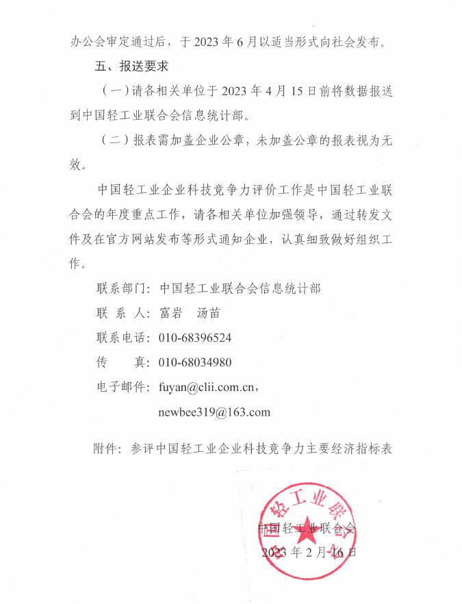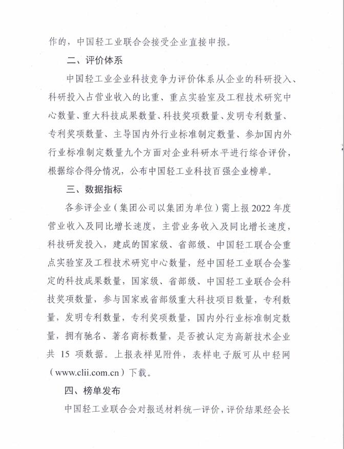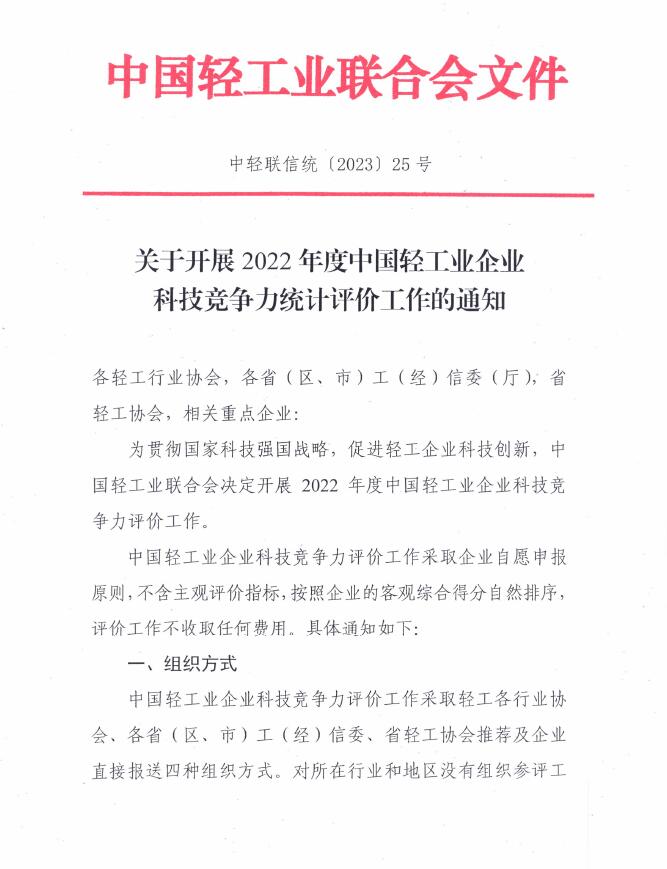 關(guān)于開(kāi)展2022年度中國(guó)輕工業(yè)企業(yè)科技競(jìng)爭(zhēng)力統(tǒng)計(jì)評(píng)價(jià)工作的通知