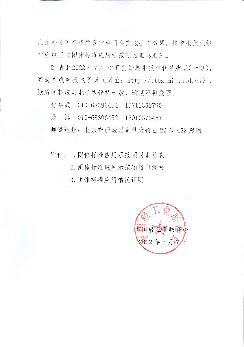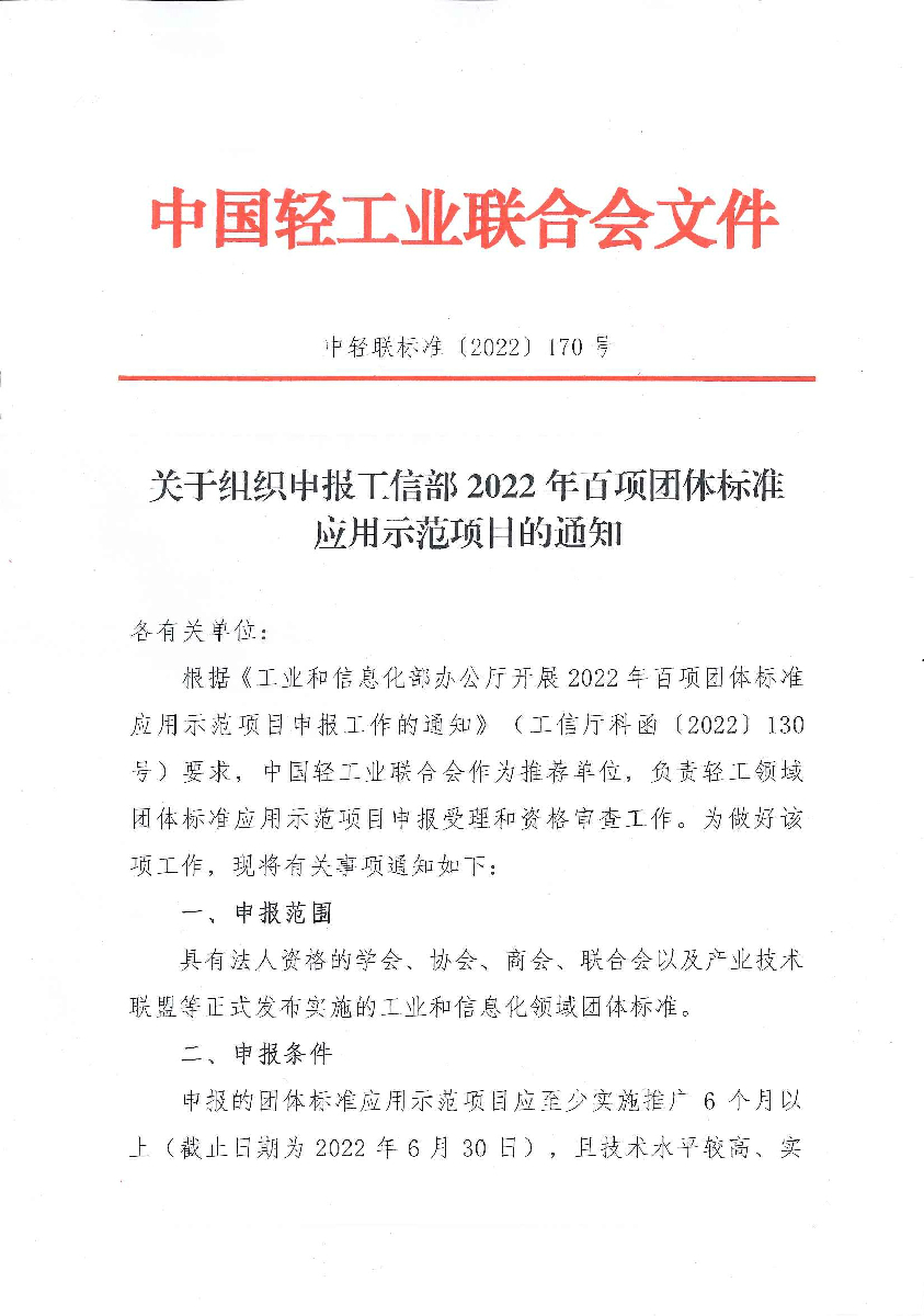 關于組織申報工信部2022年百項團體標準應用示范項目的通知