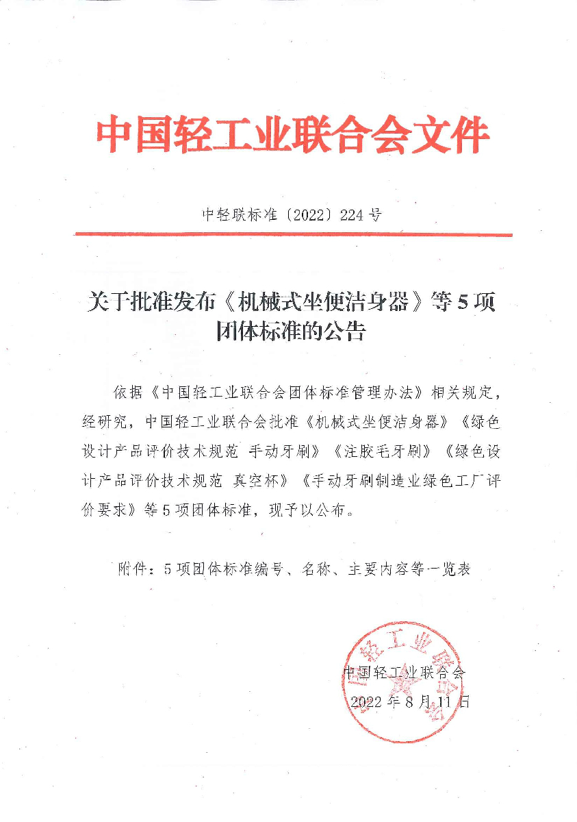 關(guān)于批準(zhǔn)發(fā)布《機械式坐便潔身器》等5項團(tuán)體標(biāo)準(zhǔn)的公告
