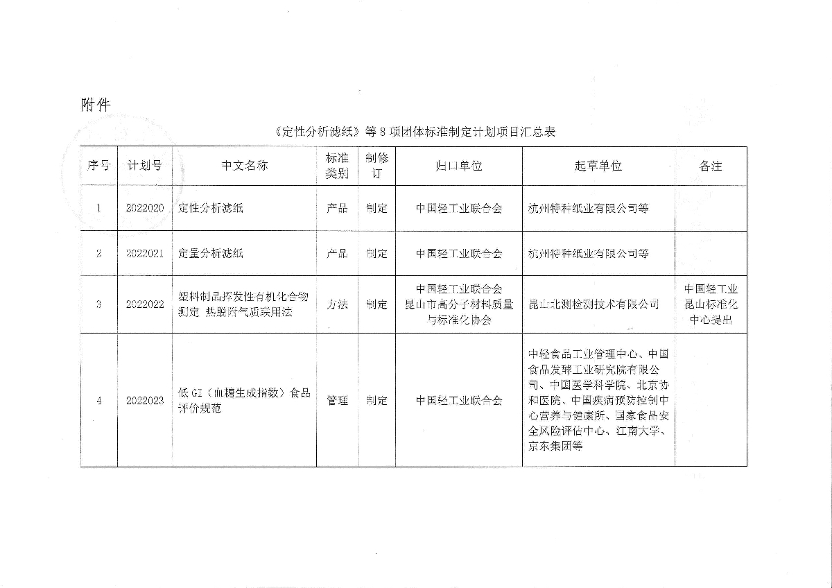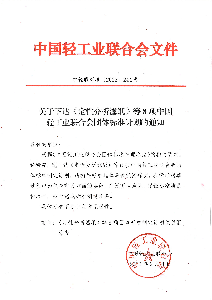 關(guān)于下達(dá)《定性分析濾紙》等8項(xiàng)中國輕工業(yè)聯(lián)合會(huì)團(tuán)體標(biāo)準(zhǔn)計(jì)劃的通知