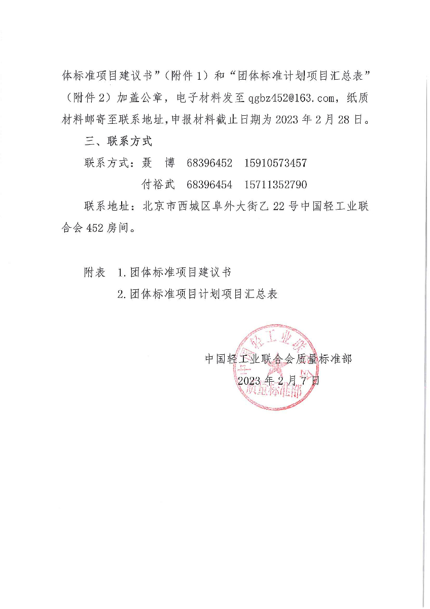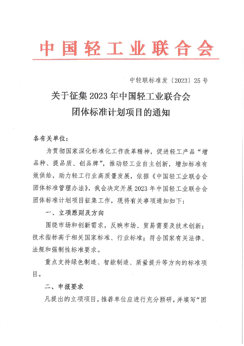 關(guān)于征集2023年中國輕工業(yè)聯(lián)合會(huì)團(tuán)體標(biāo)準(zhǔn)計(jì)劃項(xiàng)目的通知