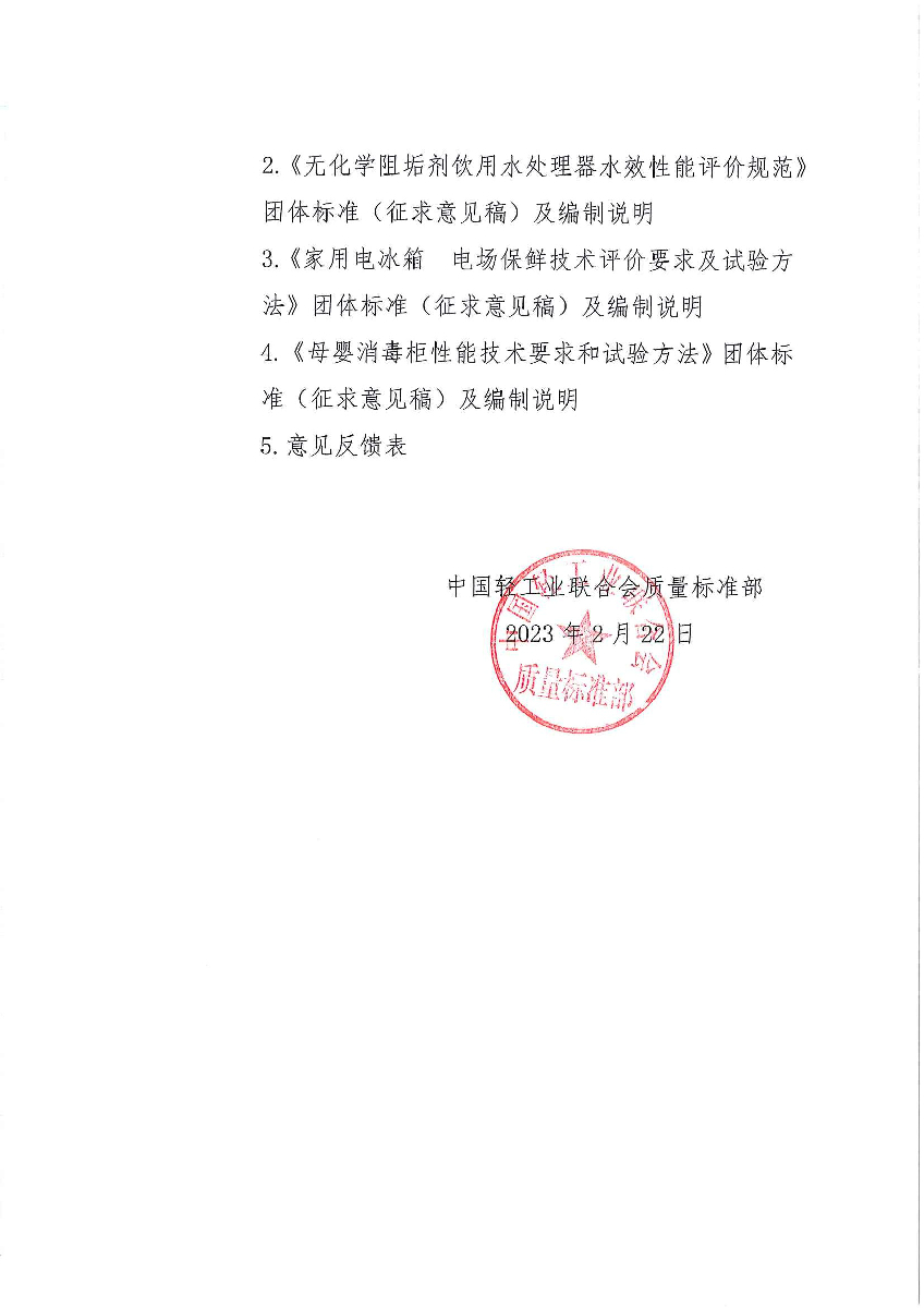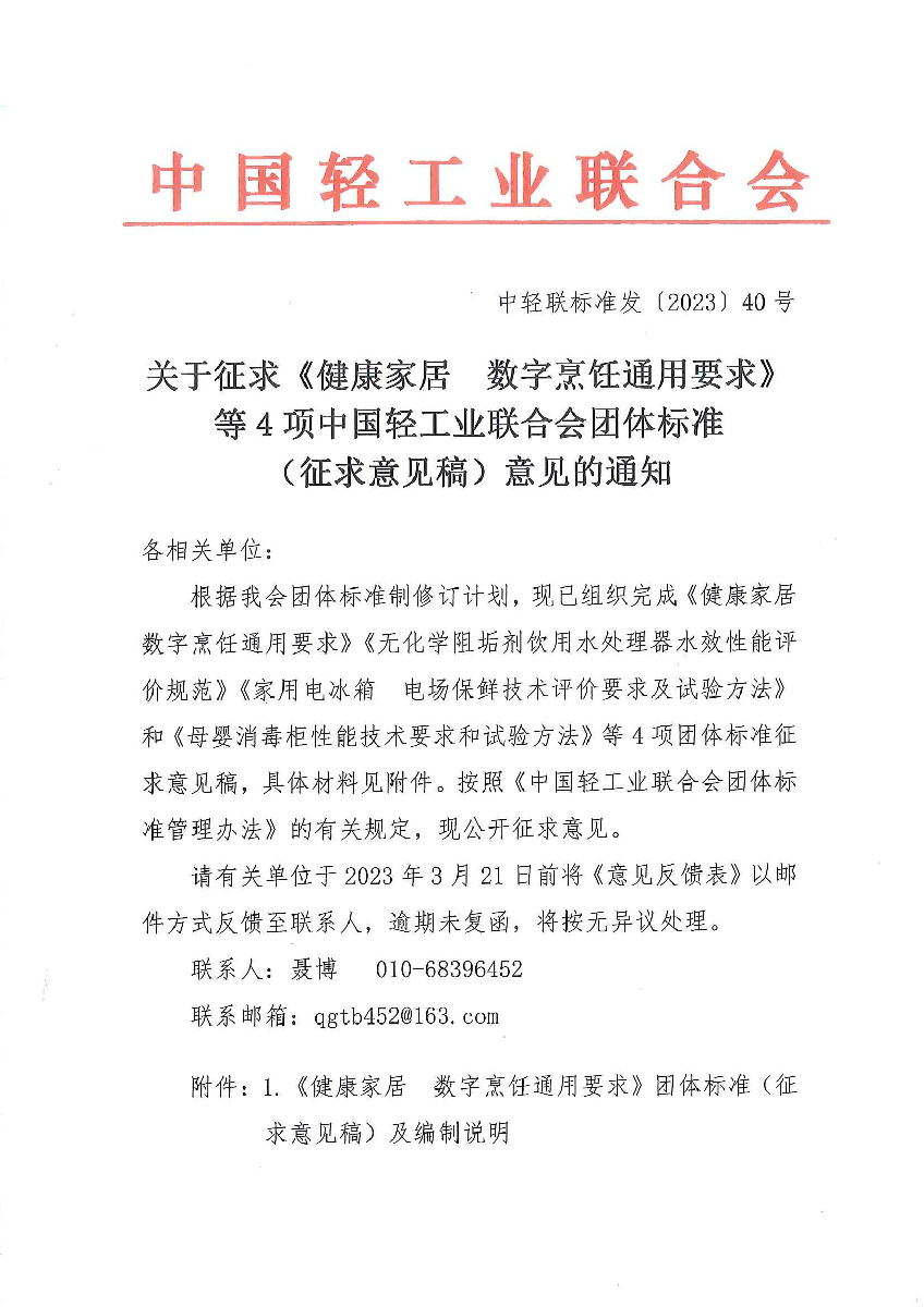 關(guān)于征求《健康家居 數(shù)字烹飪通用要求》等4項(xiàng)中國輕工業(yè)聯(lián)合會團(tuán)體標(biāo)準(zhǔn)(征求意見稿)意見的通知
