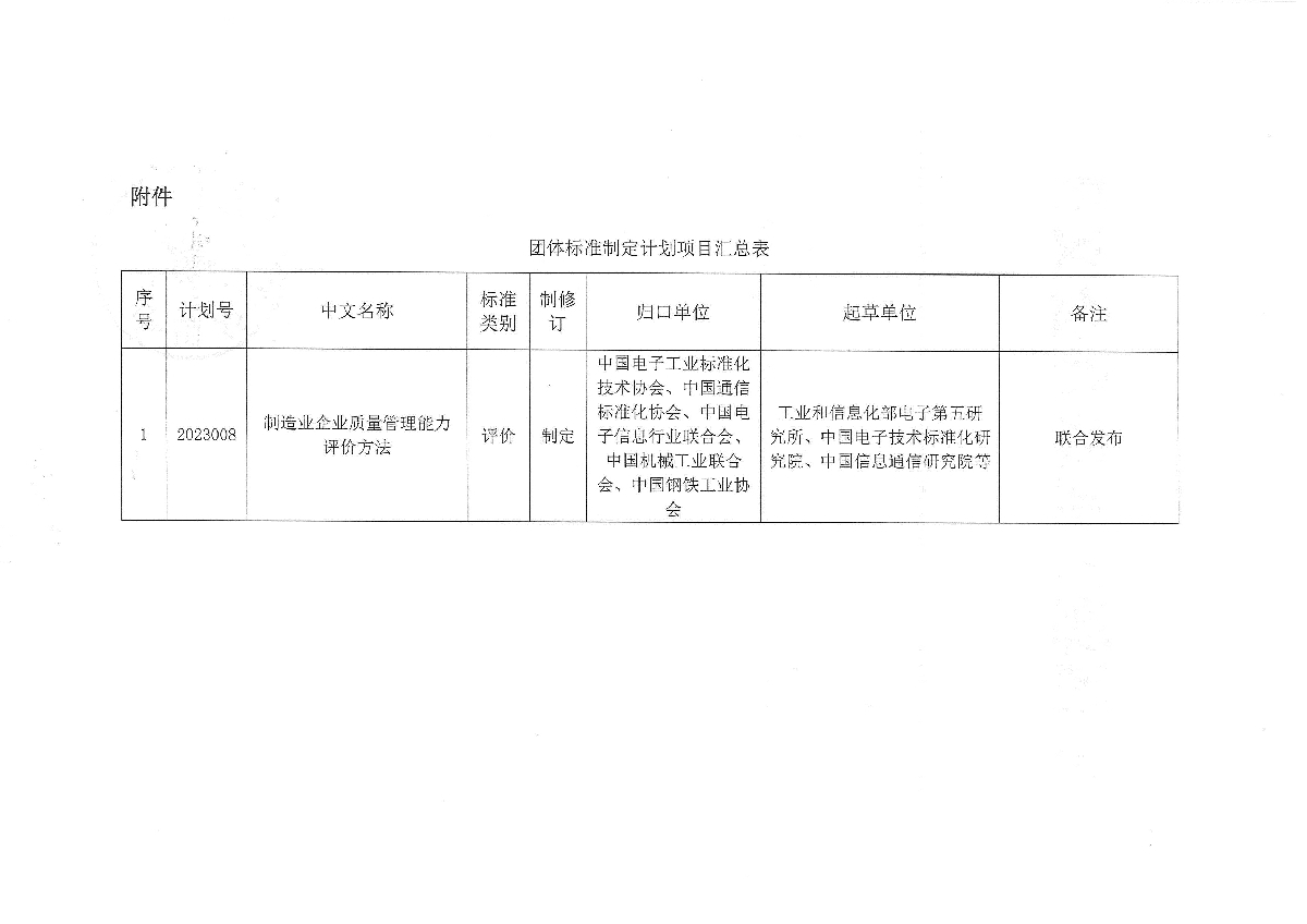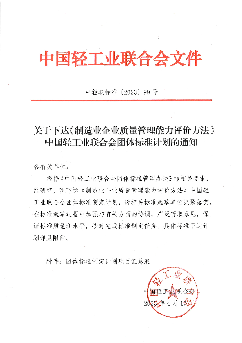 關(guān)于下達(dá)《制造業(yè)企業(yè)質(zhì)量管理能力評價方法》中國輕工業(yè)聯(lián)合會團(tuán)體標(biāo)準(zhǔn)計劃的通知