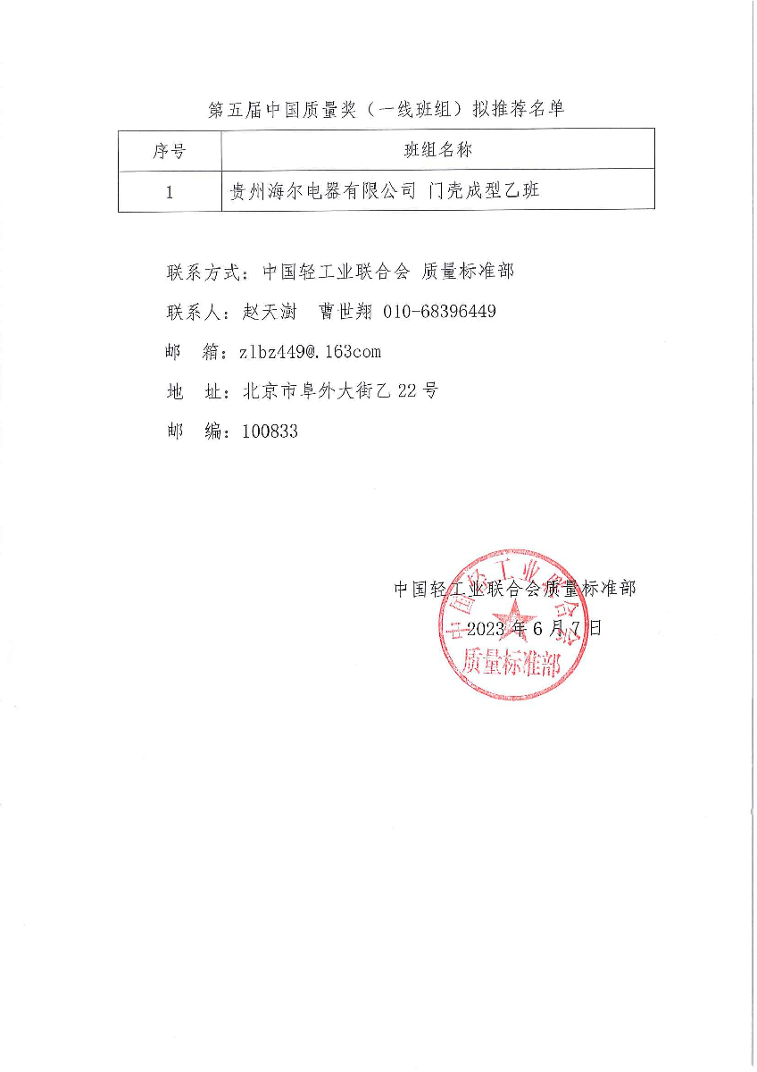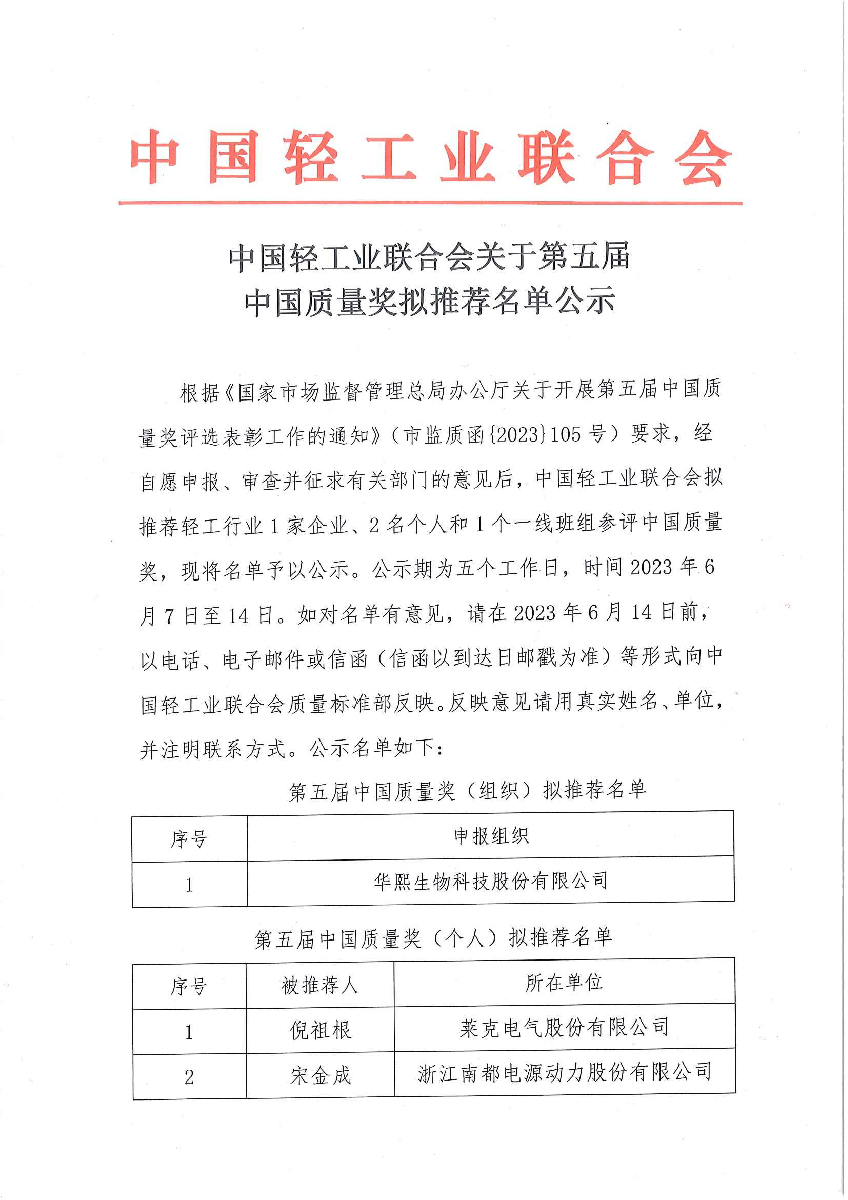 中國輕工業(yè)聯(lián)合會關(guān)于第五屆中國質(zhì)量獎擬推薦名單公示