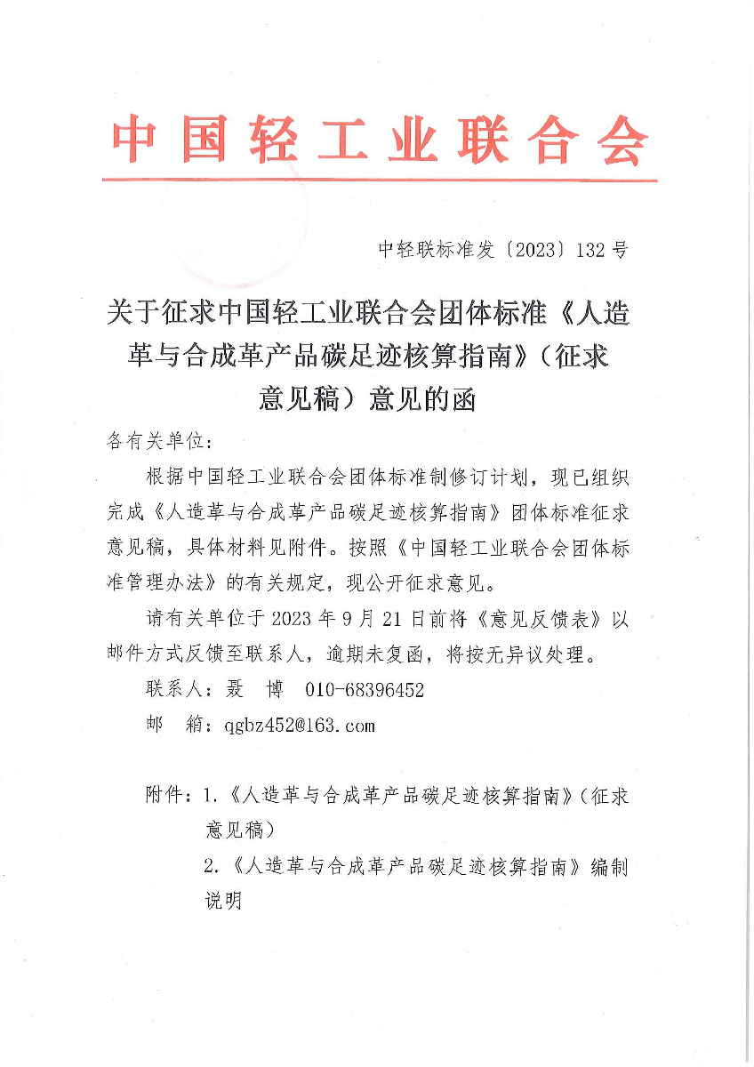 關(guān)于征求中國輕工業(yè)聯(lián)合會團體標(biāo)準(zhǔn)《人造革與合成革產(chǎn)品碳足跡核算指南》(征求意見稿)意見的函