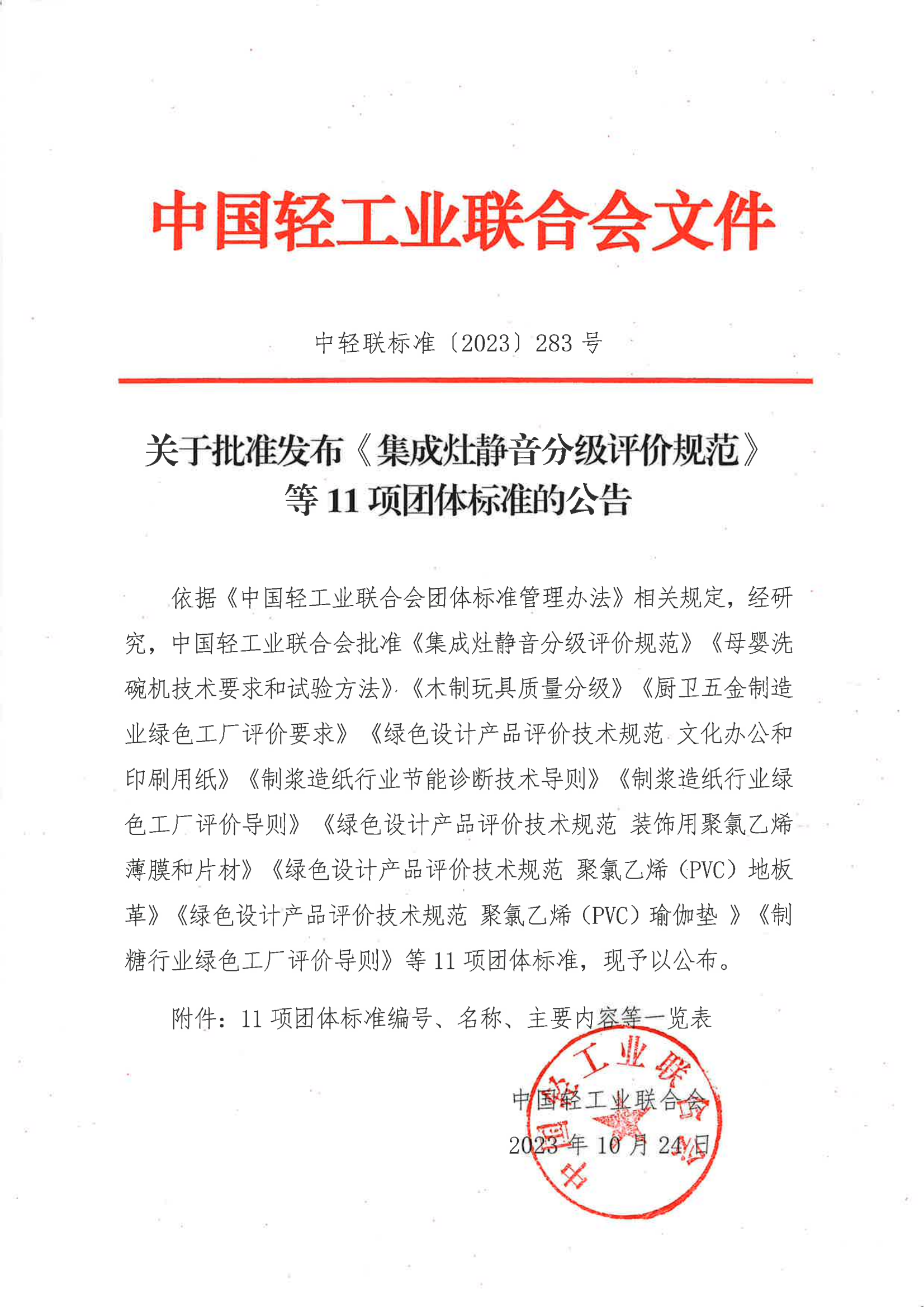 關(guān)于批準(zhǔn)發(fā)布《集成灶靜音分級評價規(guī)范》等11項團體標(biāo)準(zhǔn)的公告