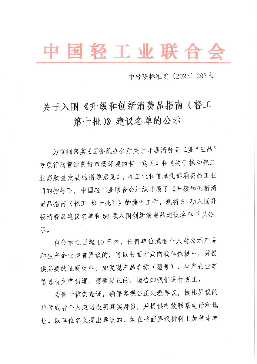 入圍《升級和創(chuàng)新消費品指南(輕工 第十批)》建議名單