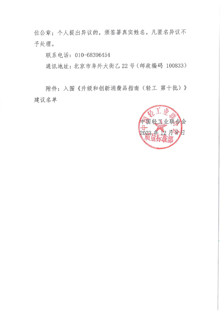 關于入圍《升級和創(chuàng)新消費品指南(輕工 第十批)》建議名單的公示