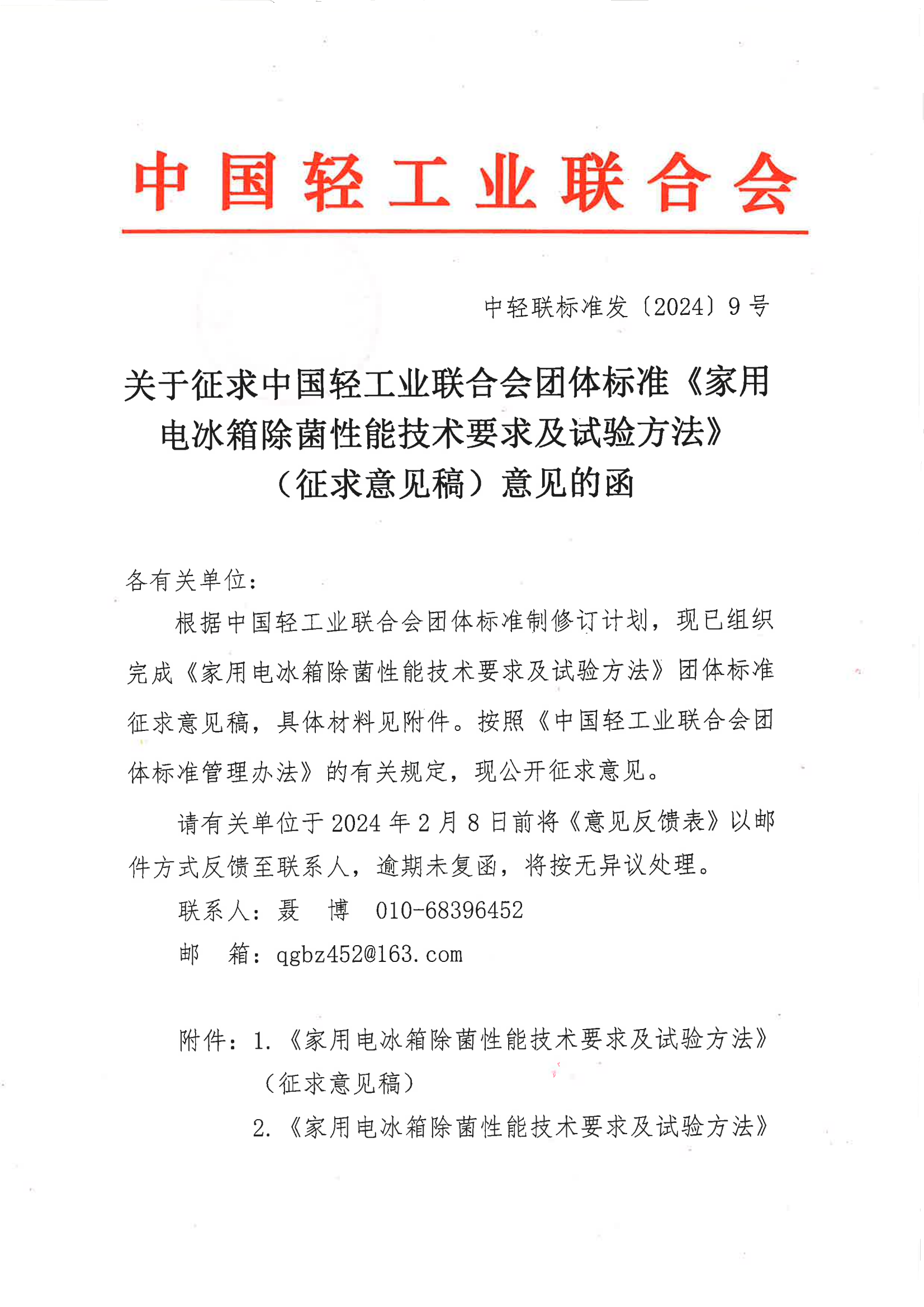 關(guān)于征求中國輕工業(yè)聯(lián)合會團體標準《家用電冰箱除菌性能技術(shù)要求及試驗方法》(征求意見稿)意見的函