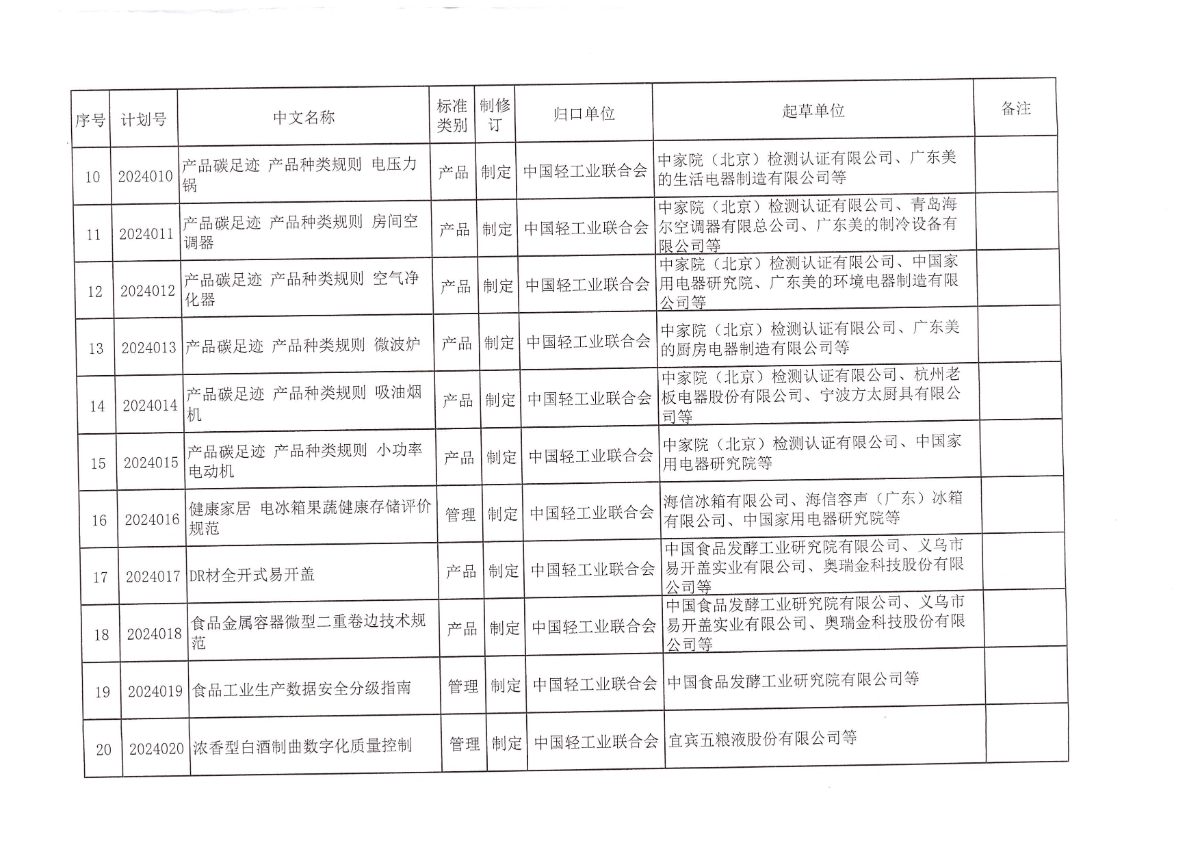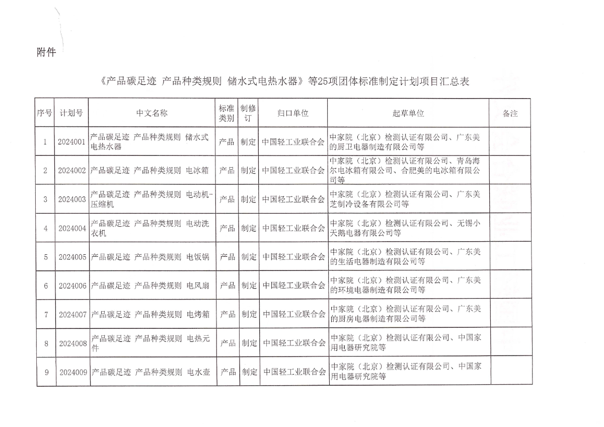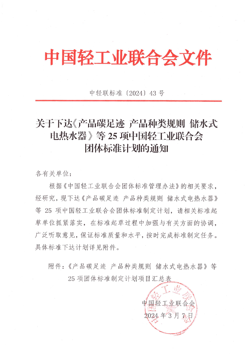 關(guān)于下達(dá)《產(chǎn)品碳足跡 產(chǎn)品種類規(guī)則 儲(chǔ)水式電熱水器》等25項(xiàng)中國(guó)輕工業(yè)聯(lián)合會(huì)團(tuán)體標(biāo)準(zhǔn)計(jì)劃的通知