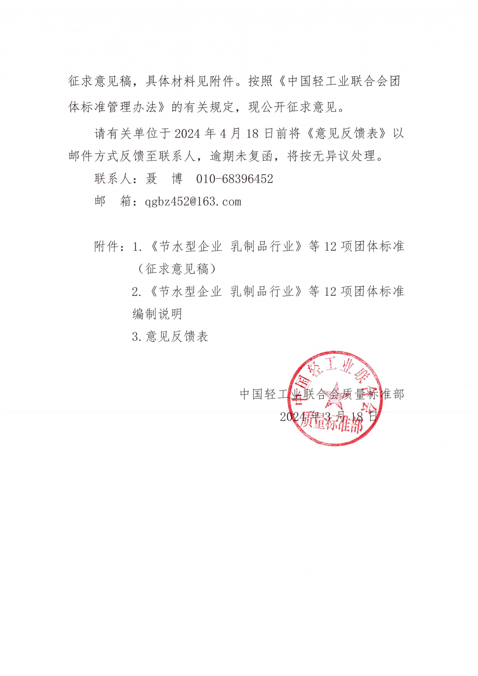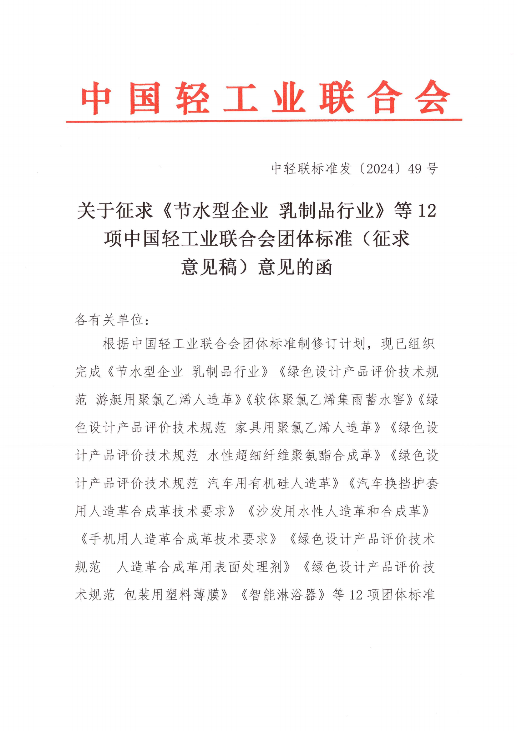 關于征求《節(jié)水型企業(yè) 乳制品行業(yè)》等12項中國輕工業(yè)聯合會團體標準(征求意見稿)意見的函