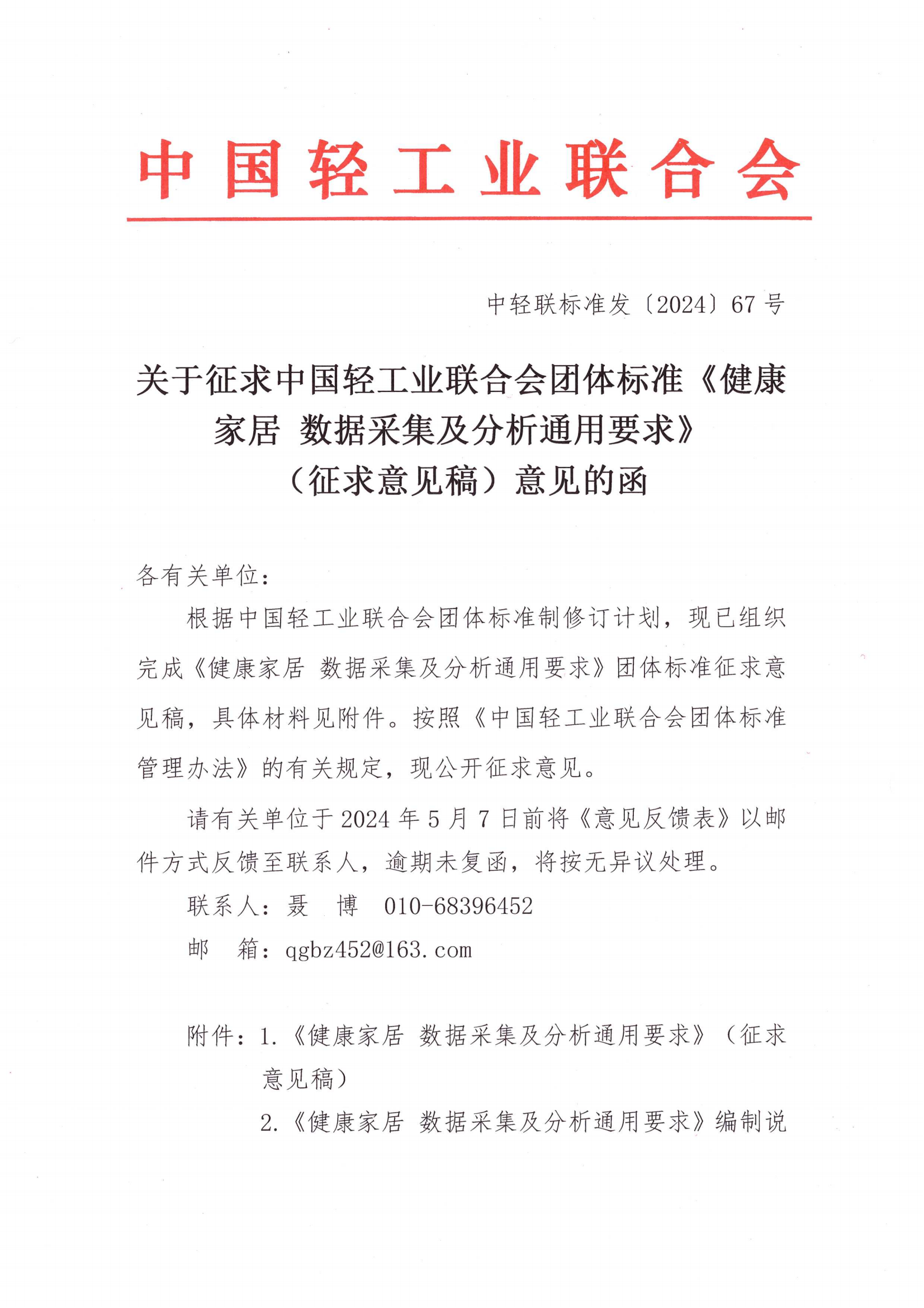 關(guān)于征求中國輕工業(yè)聯(lián)合會團(tuán)體標(biāo)準(zhǔn)《健康家居 數(shù)據(jù)采集及分析通用要求》(征求意見稿)意見的函