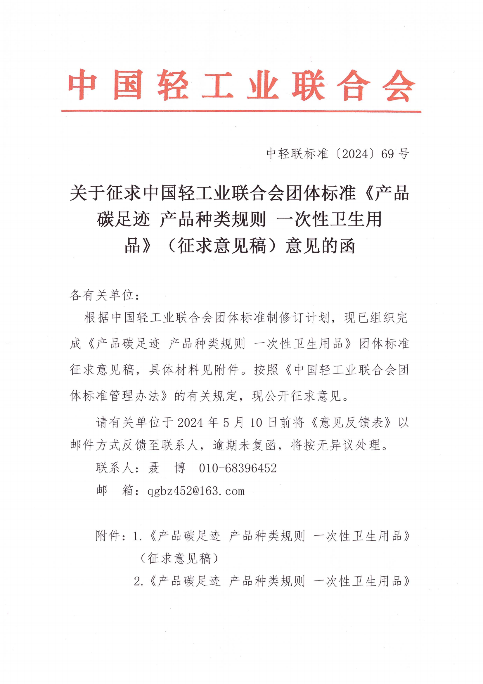 關(guān)于征求中國輕工業(yè)聯(lián)合會團體標準《產(chǎn)品碳足跡 產(chǎn)品種類規(guī)則 一次性衛(wèi)生用品》(征求意見稿)意見的函