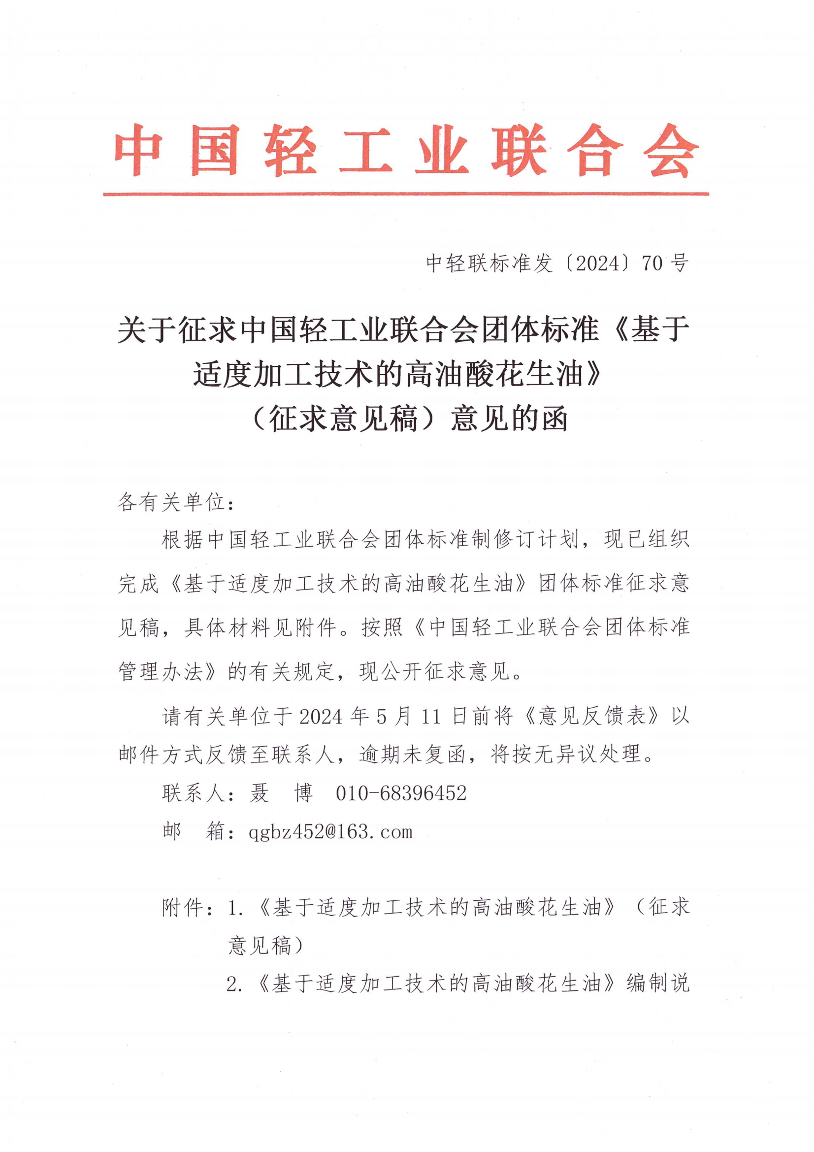 關(guān)于征求中國輕工業(yè)聯(lián)合會團(tuán)體標(biāo)準(zhǔn)《基于適度加工技術(shù)的高油酸花生油》(征求意見稿)意見的函