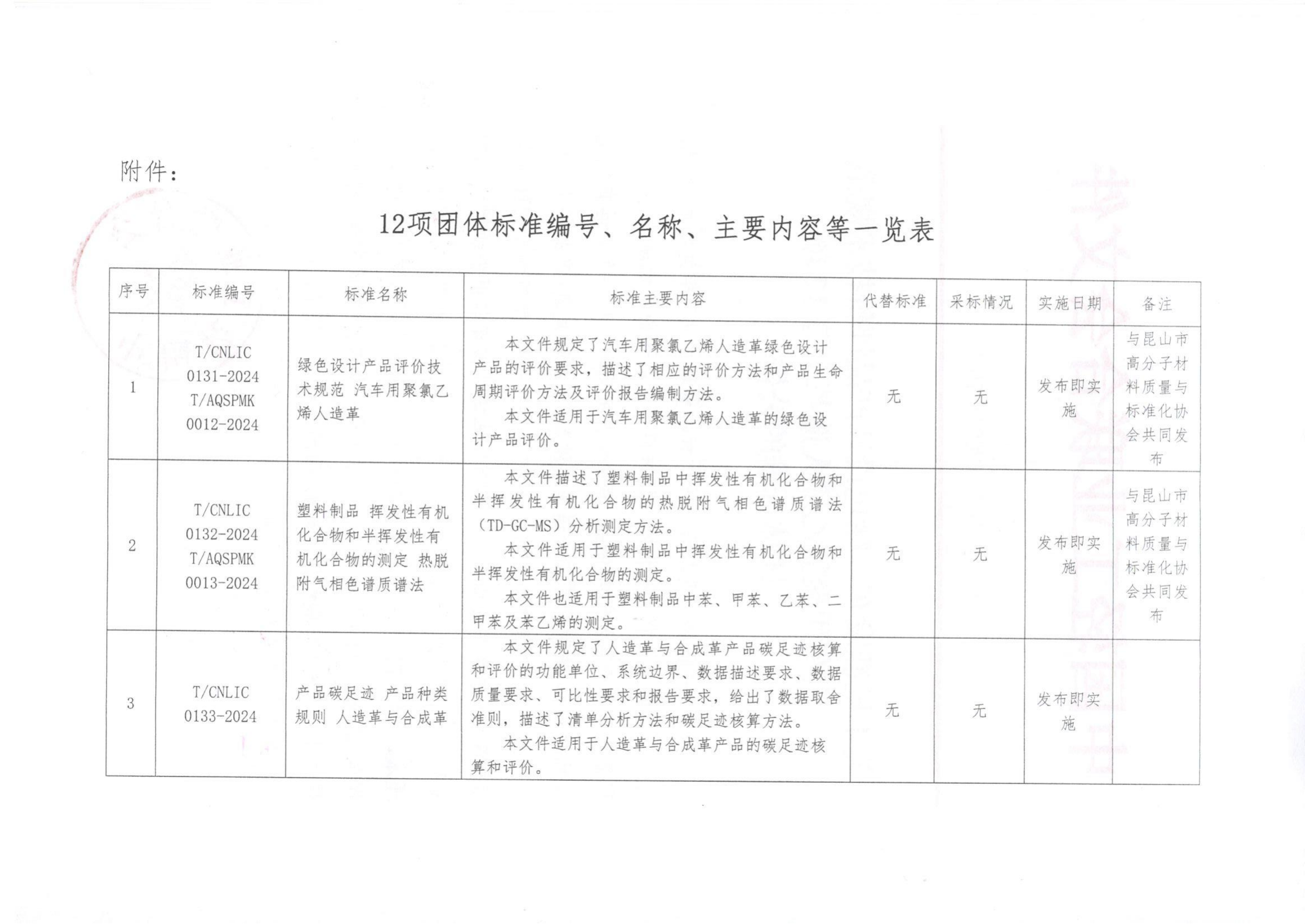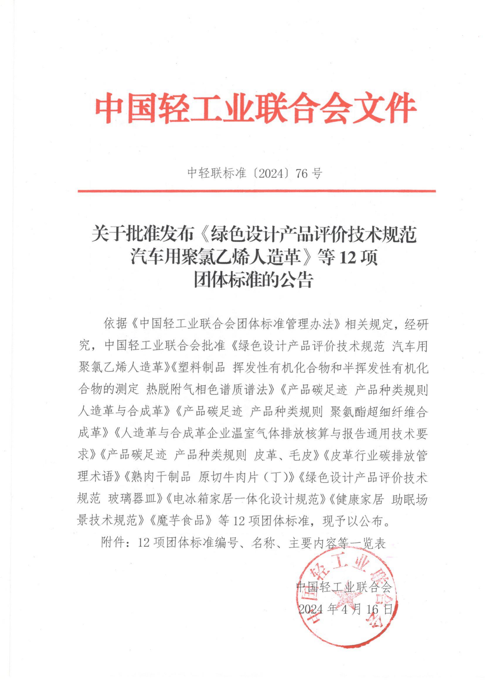 關(guān)于批準(zhǔn)發(fā)布《綠色設(shè)計(jì)產(chǎn)品評(píng)價(jià)技術(shù)規(guī)范 汽車用聚氯乙烯人造革》等12項(xiàng)團(tuán)體標(biāo)準(zhǔn)的公告
