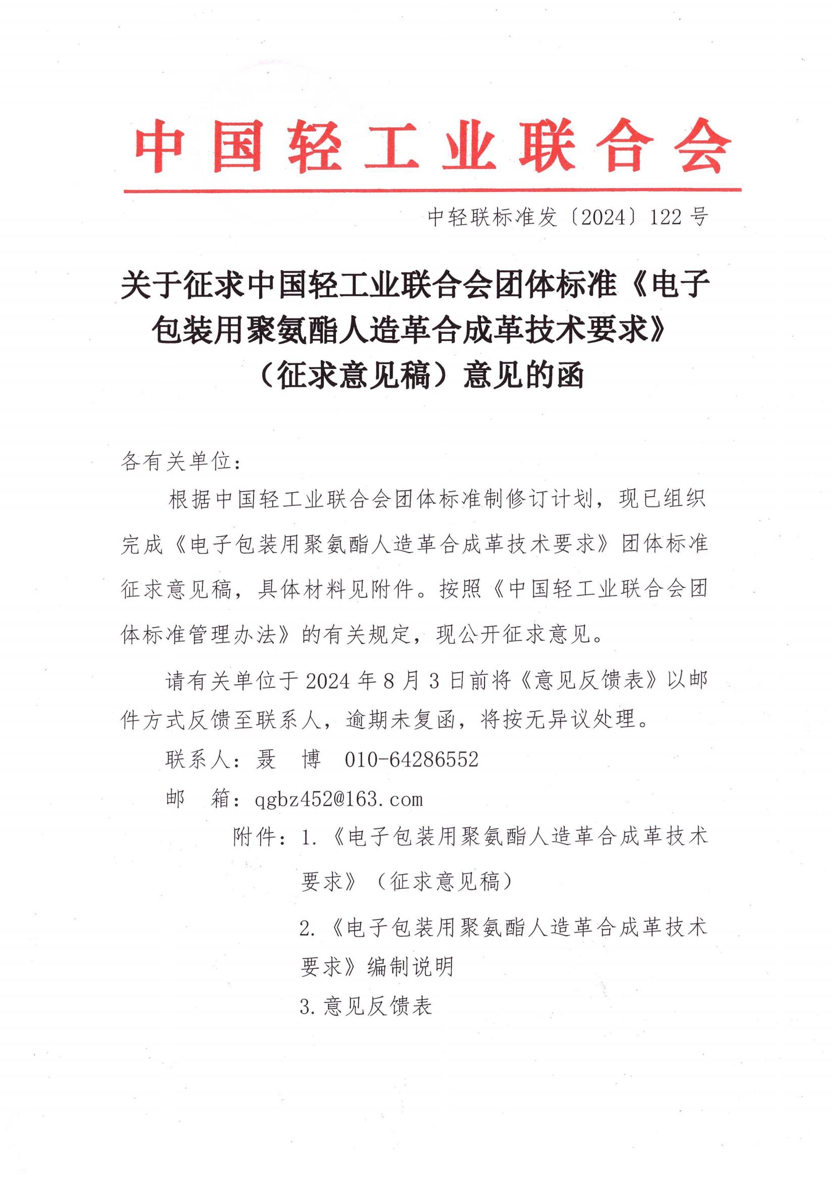 關(guān)于征求中國(guó)輕工業(yè)聯(lián)合會(huì)團(tuán)體標(biāo)準(zhǔn)《電子包裝用聚氨酯人造革合成革技術(shù)要求》(征求意見稿)意見的函