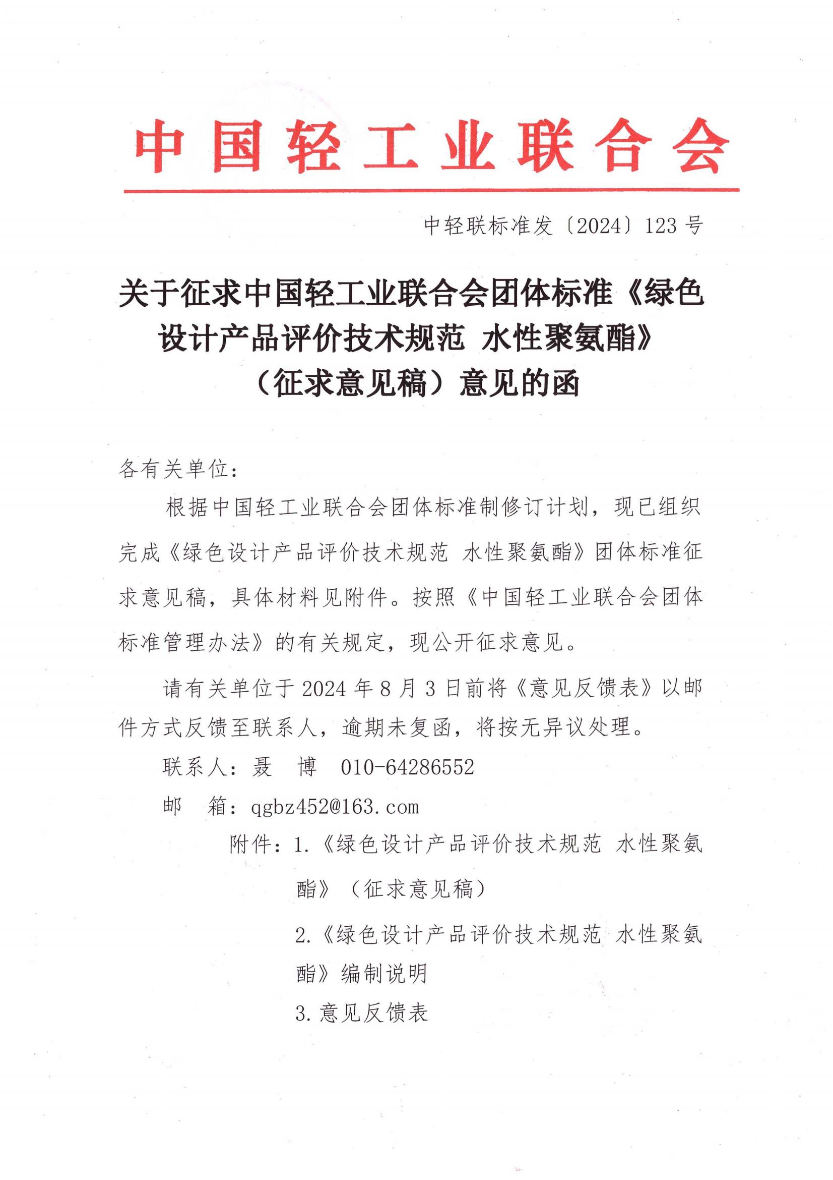 關(guān)于征求中國(guó)輕工業(yè)聯(lián)合會(huì)團(tuán)體標(biāo)準(zhǔn)《綠色設(shè)計(jì)產(chǎn)品評(píng)價(jià)技術(shù)規(guī)范 水性聚氨酯》(征求意見(jiàn)稿)意見(jiàn)的函
