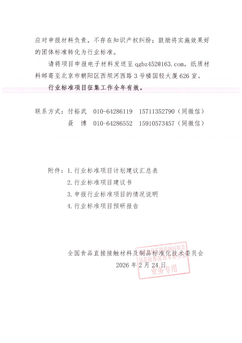 2026(7號(hào)文)關(guān)于征集2026年食品接觸領(lǐng)域行業(yè)標(biāo)準(zhǔn)項(xiàng)目通知.pdf