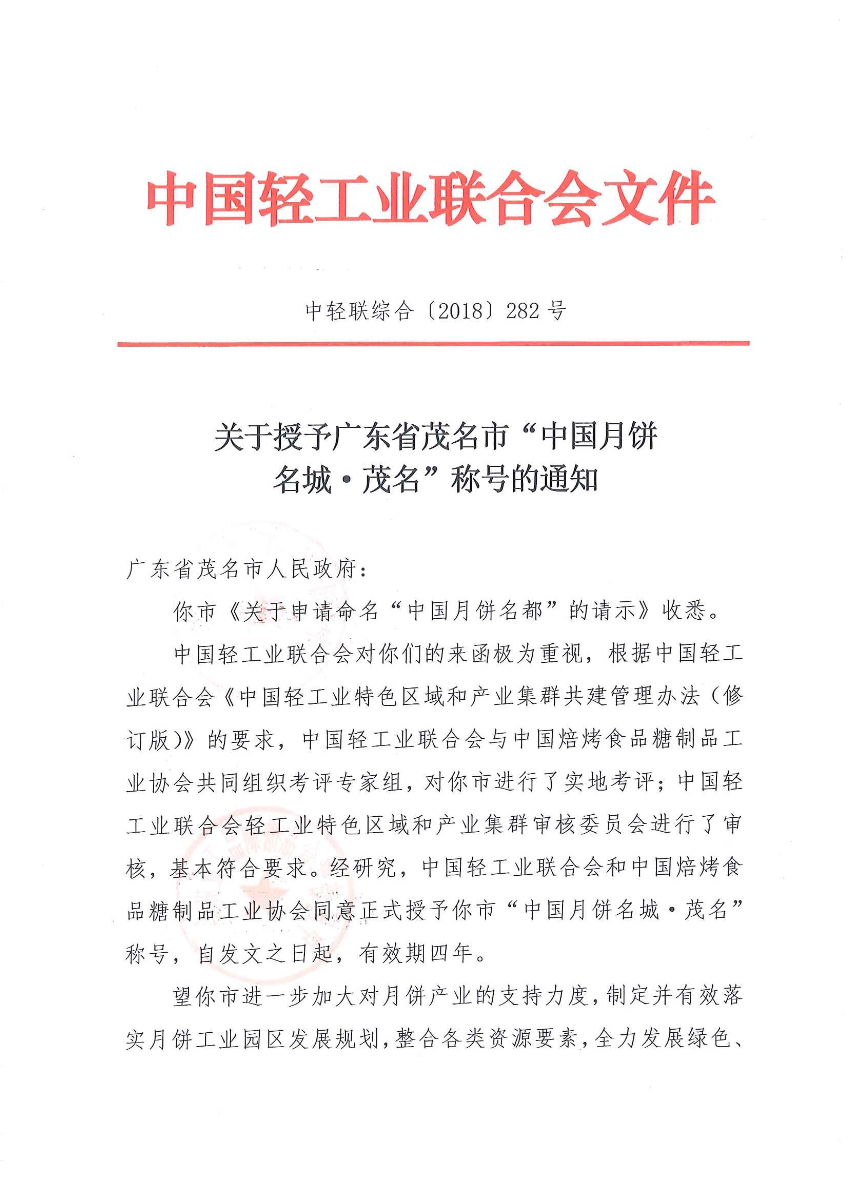 關(guān)于授予廣東省茂名市“中國月餅名城·茂名”稱號的通知