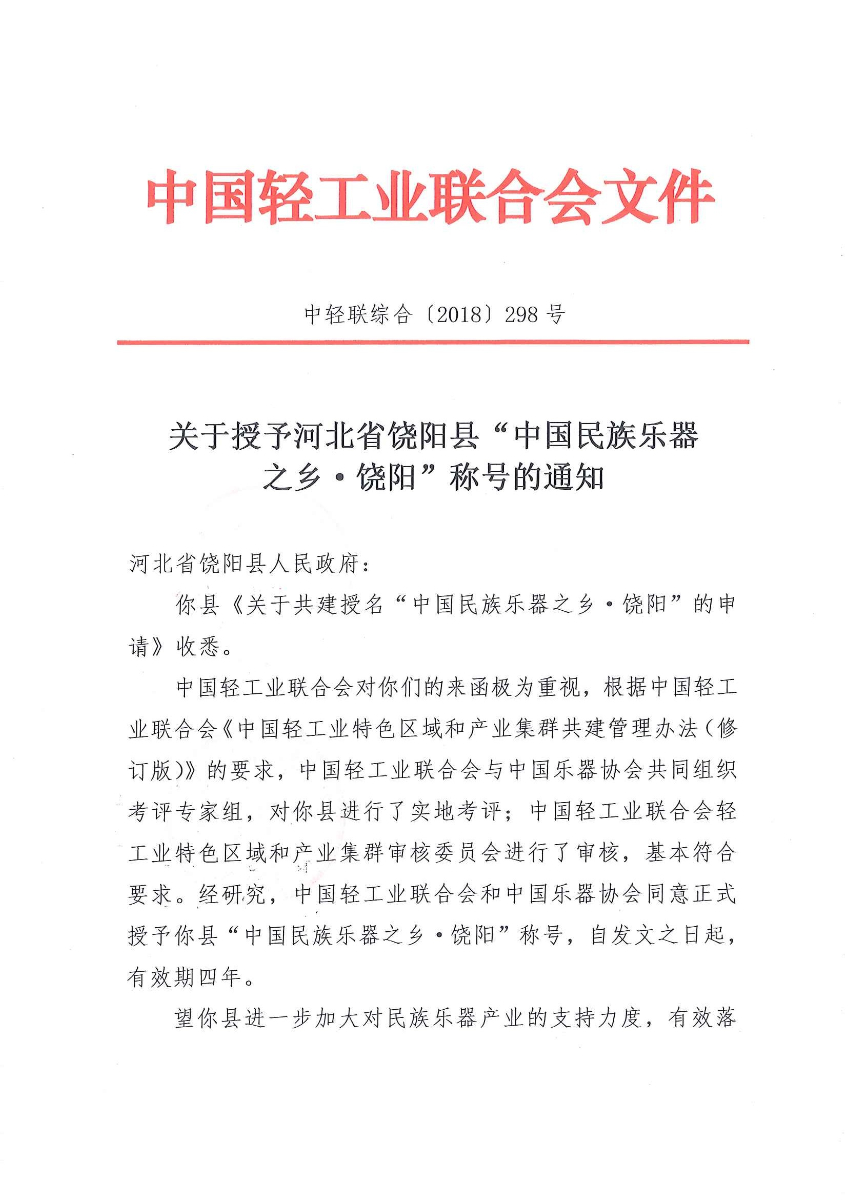 關(guān)于授予河北省饒陽(yáng)縣“中國(guó)民族樂(lè)器之鄉(xiāng)·饒陽(yáng)”稱號(hào)的通知