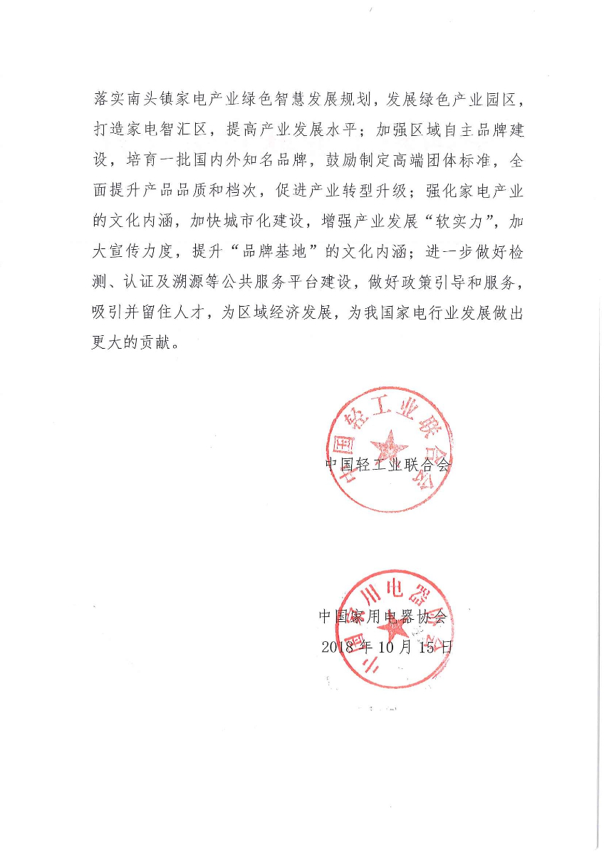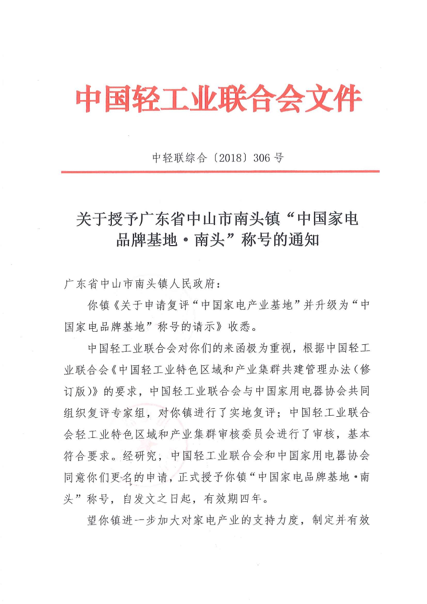 關(guān)于授予廣東省中山市南頭鎮(zhèn)“中國家電品牌基地·南頭”稱號的通知