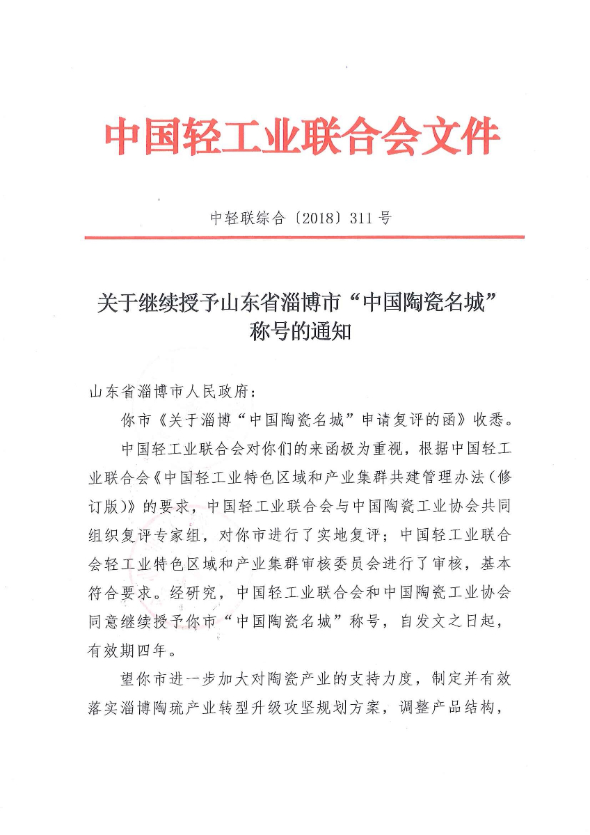 關(guān)于繼續(xù)授予山東省淄博市“中國陶瓷名城”稱號(hào)的通知