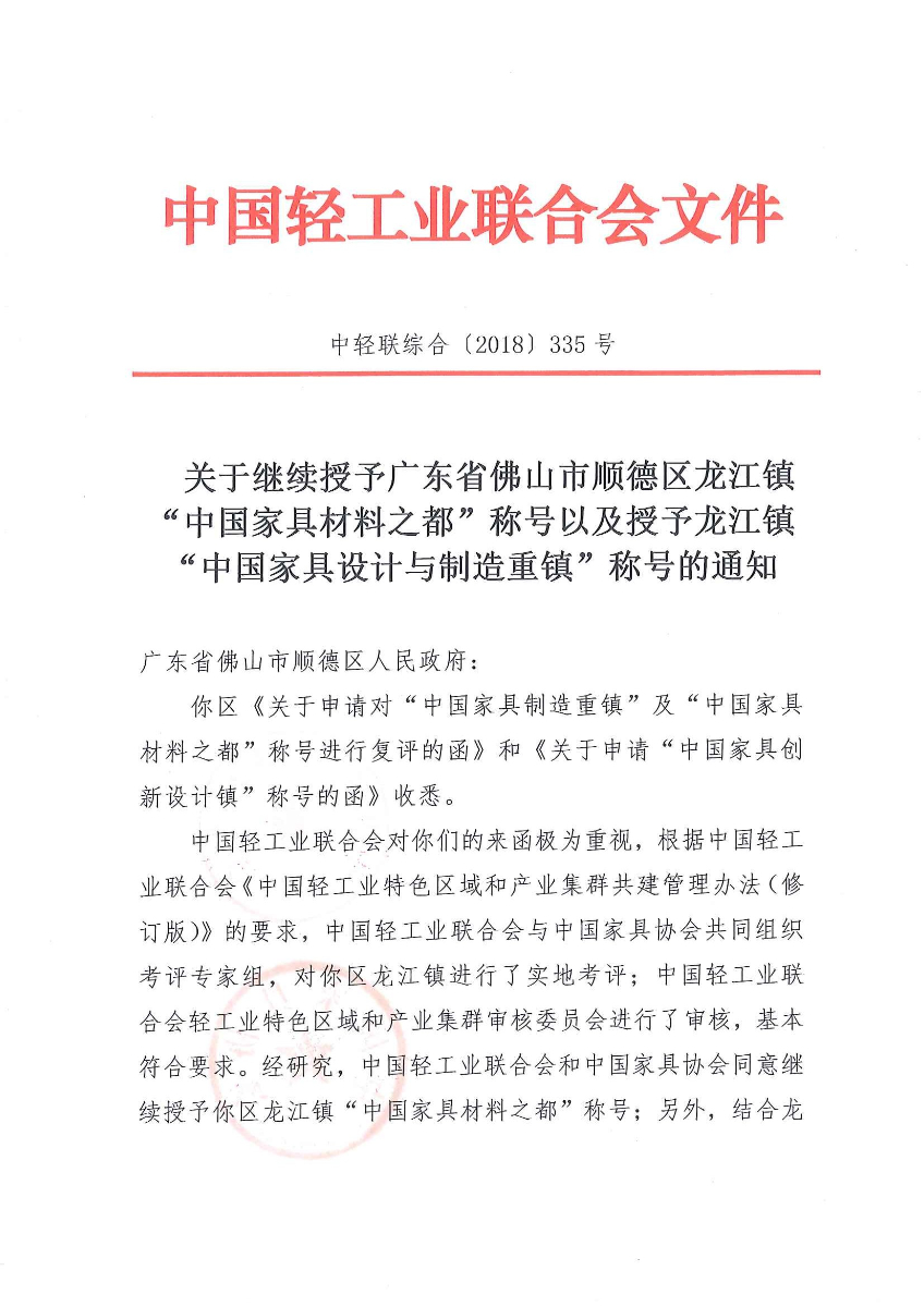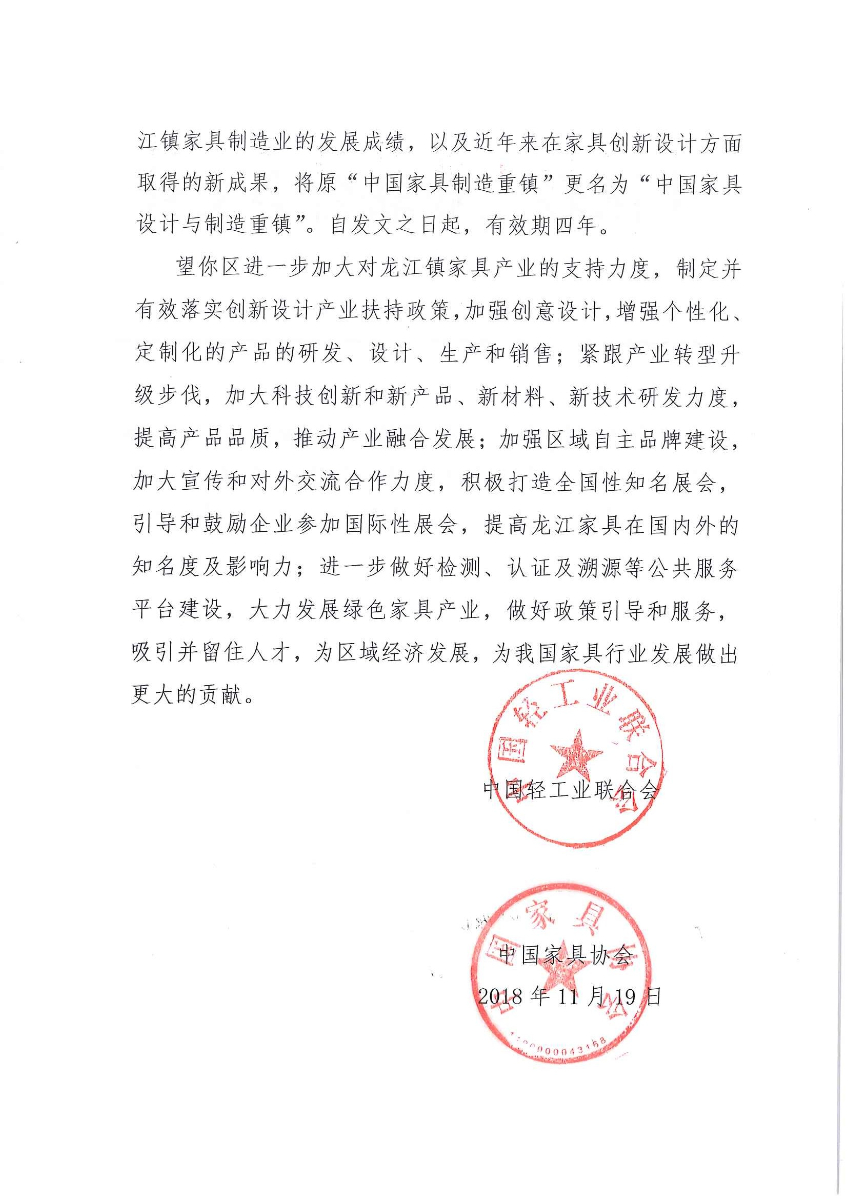 關(guān)于繼續(xù)授予廣東省佛山市順德區(qū)龍江鎮(zhèn)“中國家具材料之都”稱號以及授予龍江鎮(zhèn)“中國家具設(shè)計與制造重鎮(zhèn)”稱號的通知