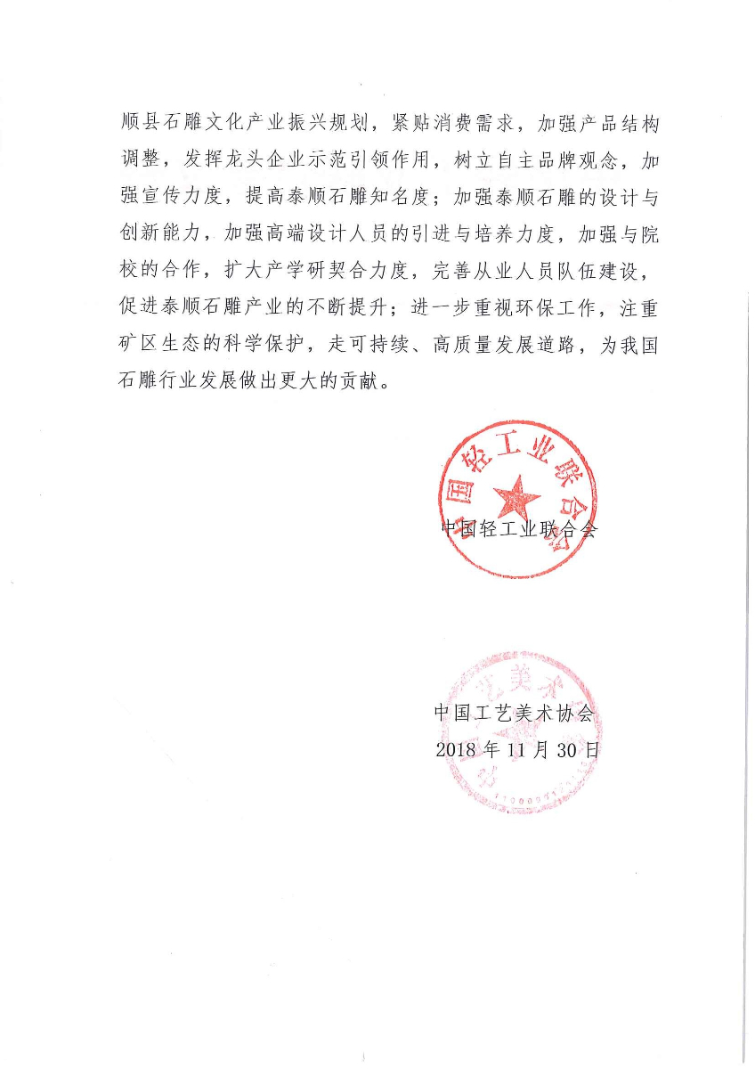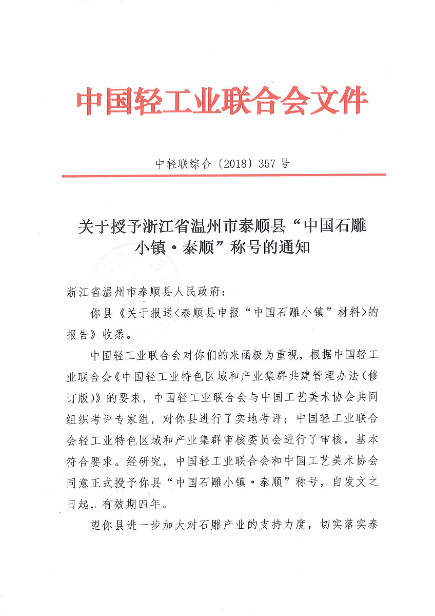 關(guān)于授予浙江省溫州市泰順縣“中國石雕小鎮(zhèn)·泰順”稱號的通知