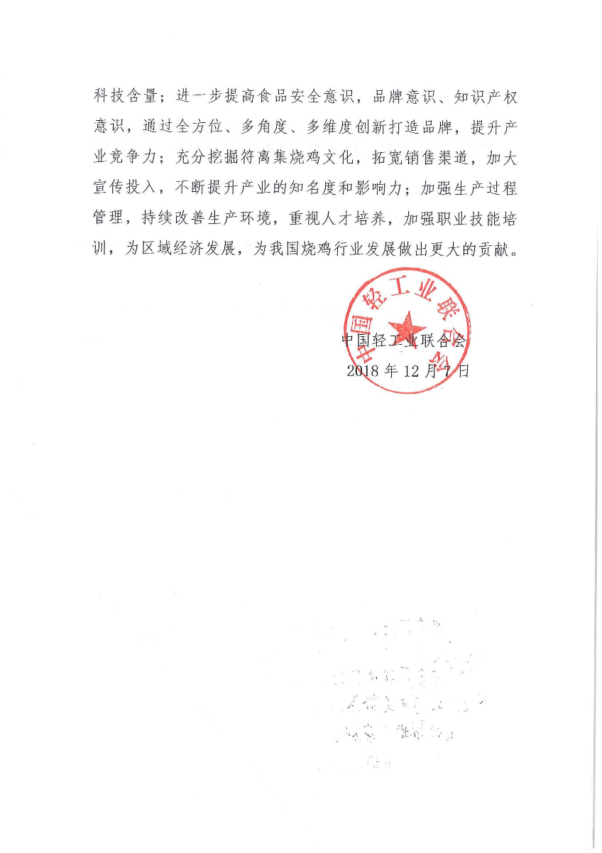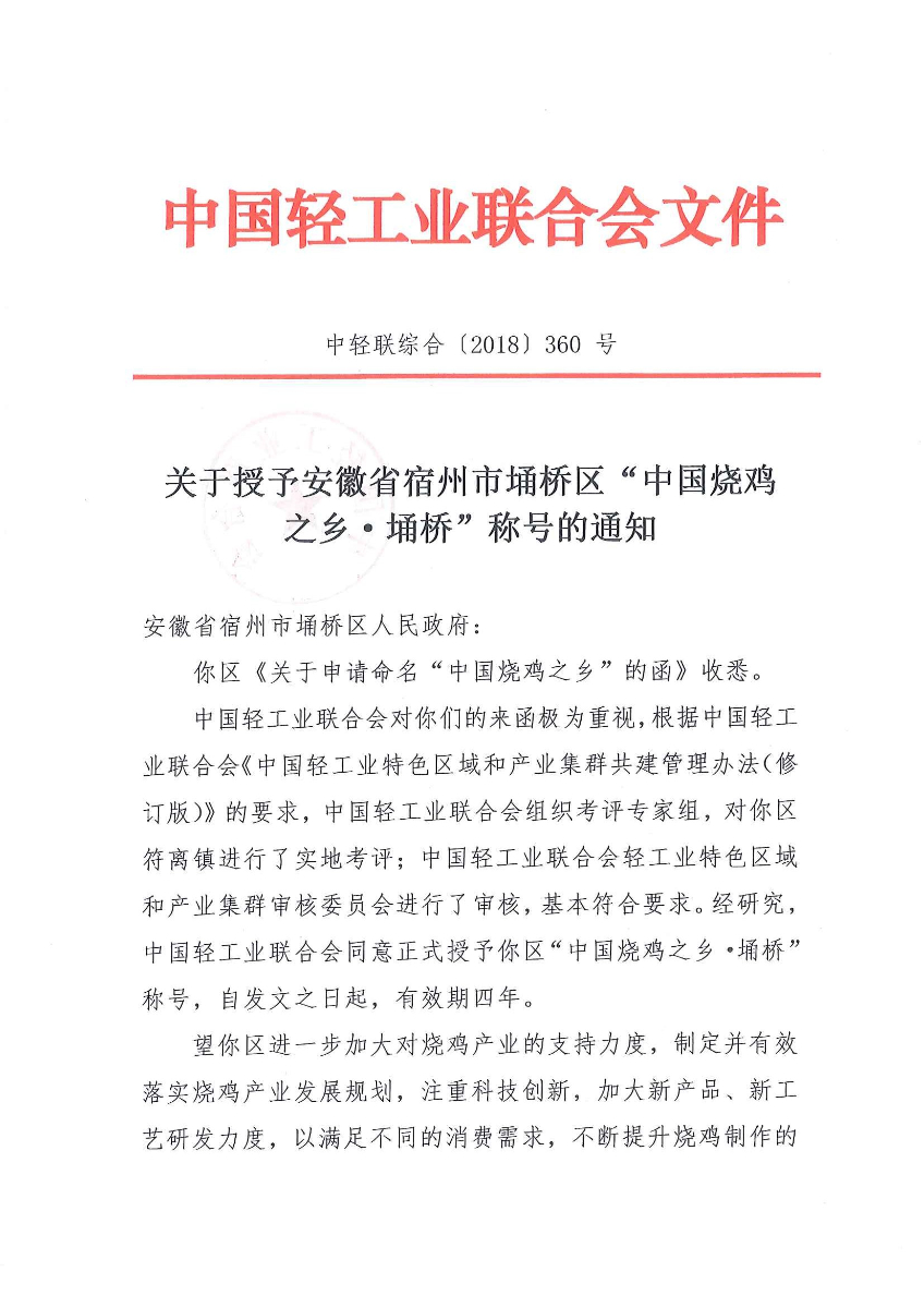 關(guān)于授予安徽省宿州市埇橋區(qū)“中國燒雞之鄉(xiāng)·埇橋”稱號(hào)的通知