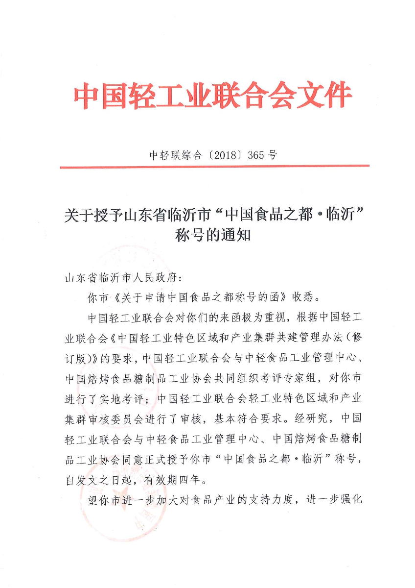 關(guān)于授予山東省臨沂市“中國食品之都·臨沂”稱號的通知