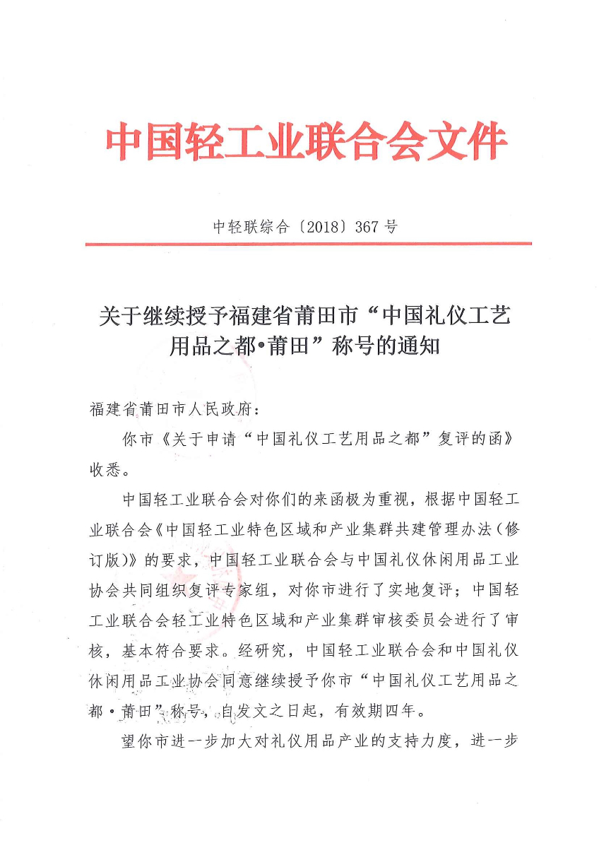 關(guān)于繼續(xù)授予福建省莆田市“中國(guó)禮儀工藝用品之都·莆田”稱號(hào)的通知