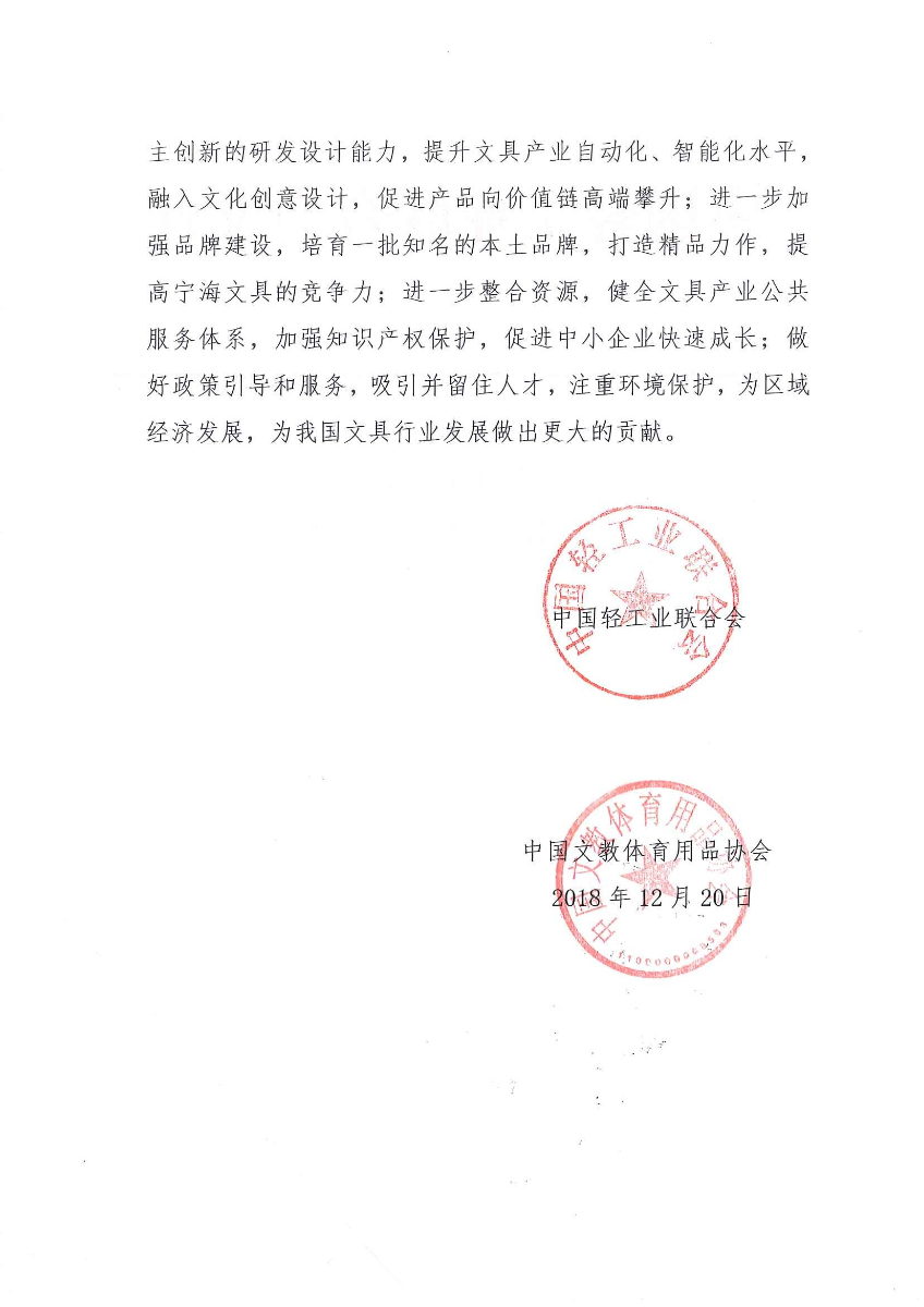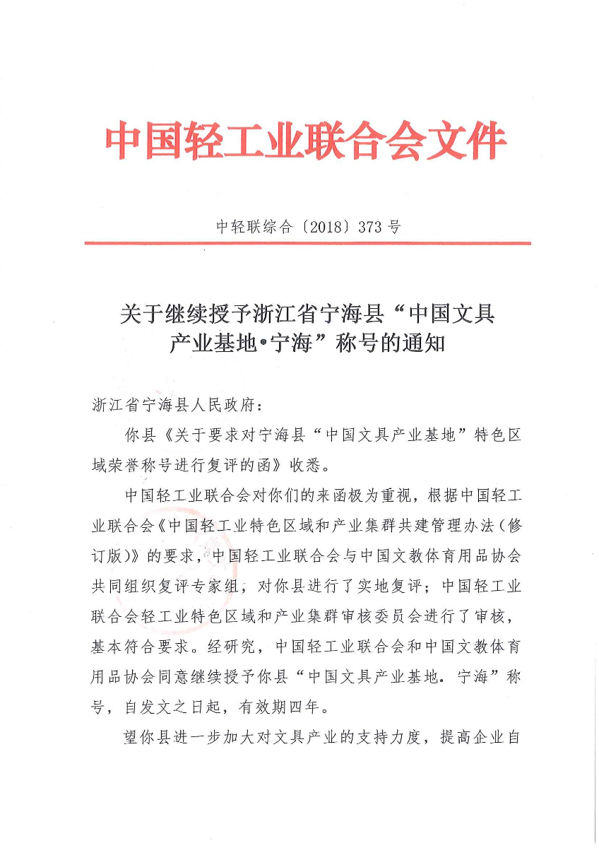 關(guān)于繼續(xù)授予浙江省寧??h“中國(guó)文具產(chǎn)業(yè)基地·寧?!狈Q號(hào)的通知