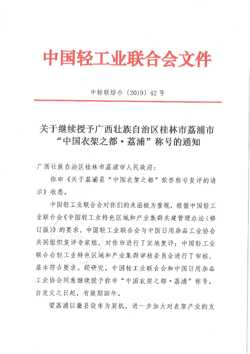 關(guān)于繼續(xù)授予廣西壯族自治區(qū)桂林市荔浦市“中國(guó)衣架之都·荔浦”稱(chēng)號(hào)的通知