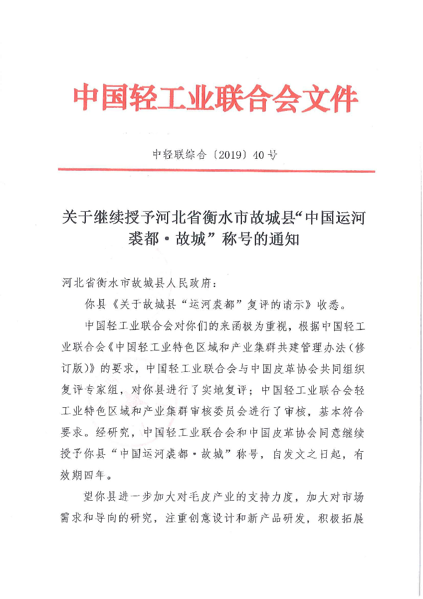 關(guān)于繼續(xù)授予河北省衡水市故城縣"中國(guó)運(yùn)河裘都·故城"稱號(hào)的通知