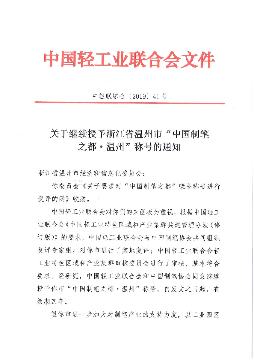 關(guān)于繼續(xù)授予浙江省溫州市"中國(guó)制筆之都·溫州"稱號(hào)的通知