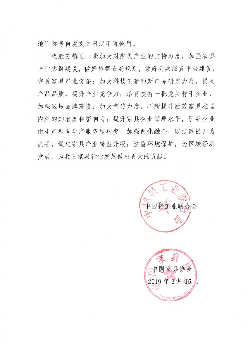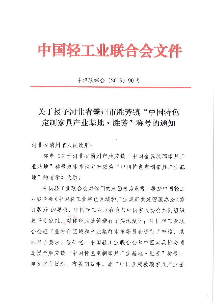 關(guān)于授予河北省霸州市勝芳鎮(zhèn)"中國特色定制家具產(chǎn)業(yè)基地·勝芳"稱號的通知