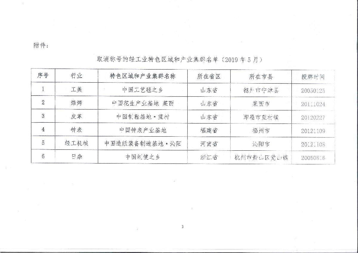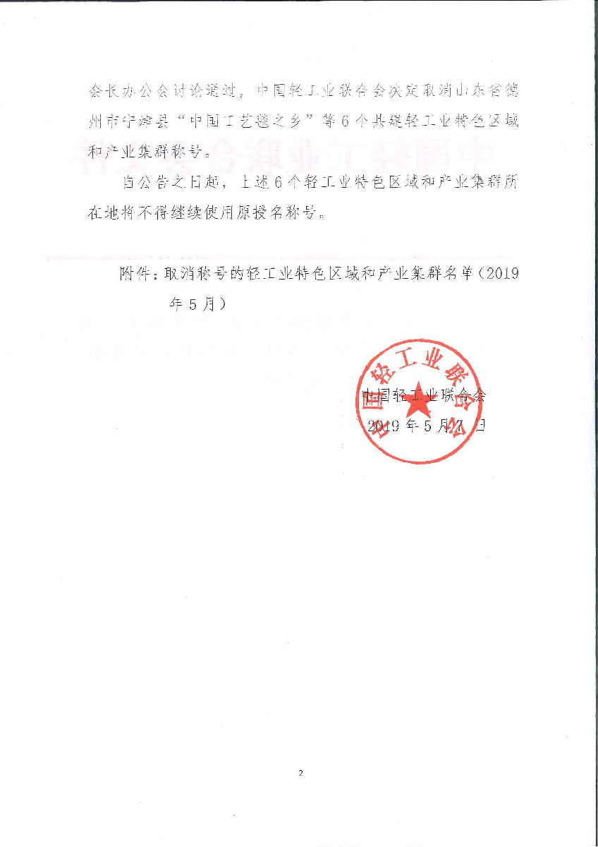 關(guān)于取消山東省德州市寧津縣“中國(guó)工藝毯之鄉(xiāng)”等6個(gè)輕工業(yè)特色區(qū)域和產(chǎn)業(yè)集群稱號(hào)的公告