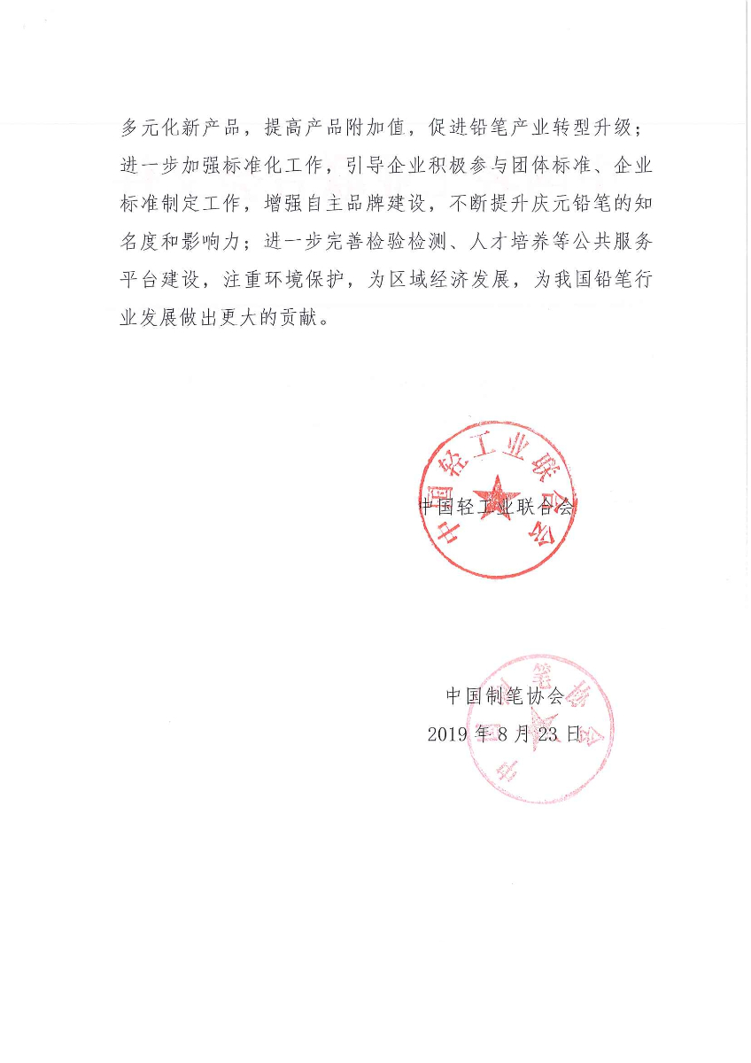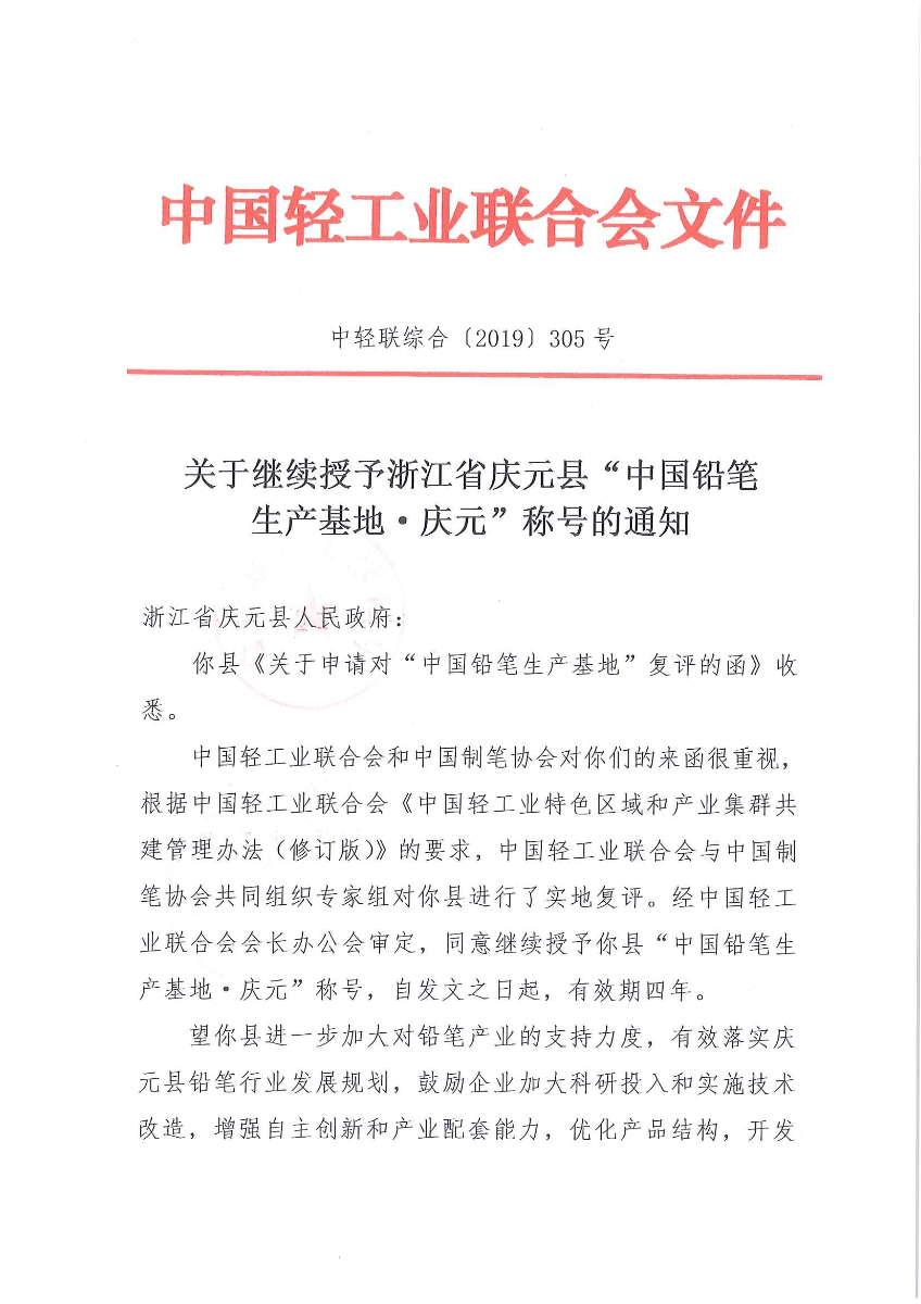 關(guān)于繼續(xù)授予浙江省慶元縣“中國鉛筆生產(chǎn)基地·慶元”稱號的通知