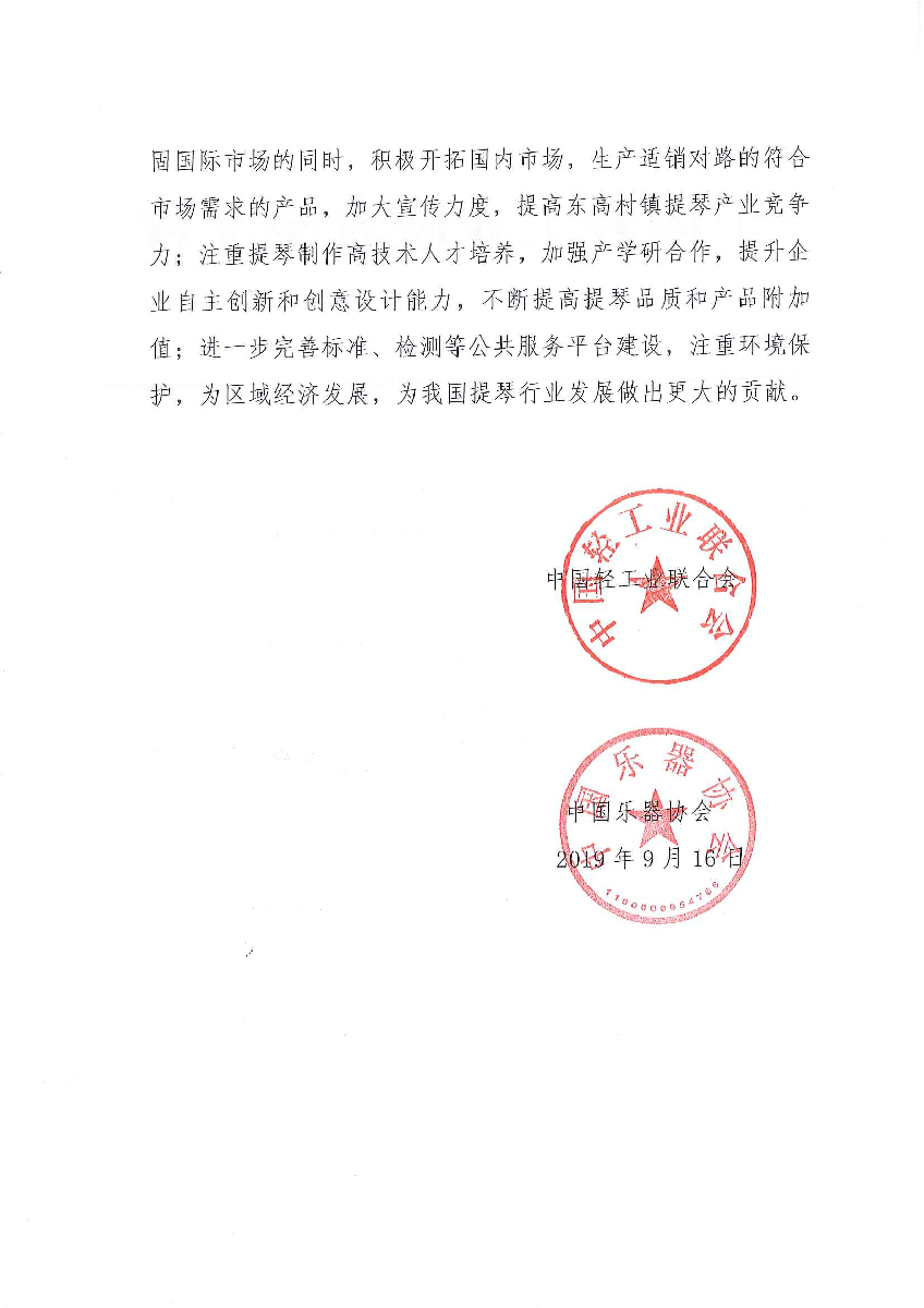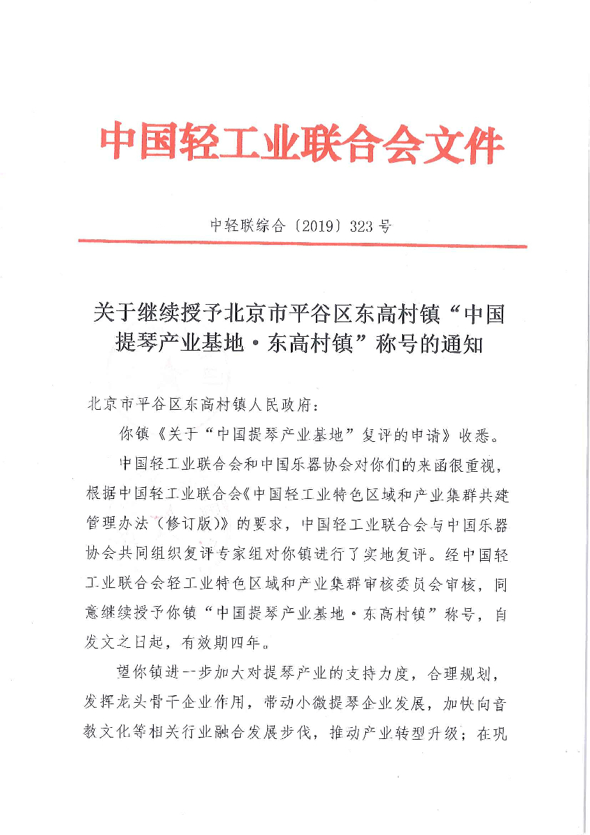 關(guān)于繼續(xù)授予北京市平谷區(qū)東高村鎮(zhèn)“中國(guó)提琴產(chǎn)業(yè)基地·東高村鎮(zhèn)”稱(chēng)號(hào)的通知
