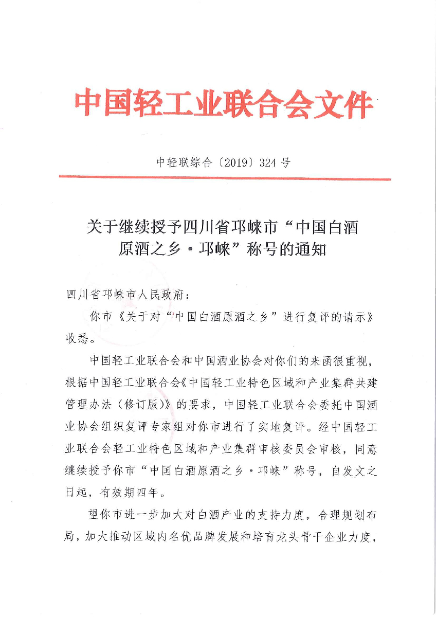 關(guān)于繼續(xù)授予四川省邛崍市“中國白酒原酒之鄉(xiāng)·邛崍”稱號的通知