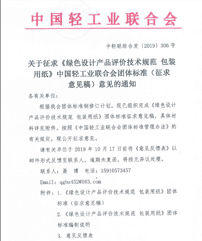 關于征求《綠色設計產(chǎn)品評價技術規(guī)范 包裝用紙》中國輕工業(yè)聯(lián)合會團體標準(征求意見稿)意見的通知