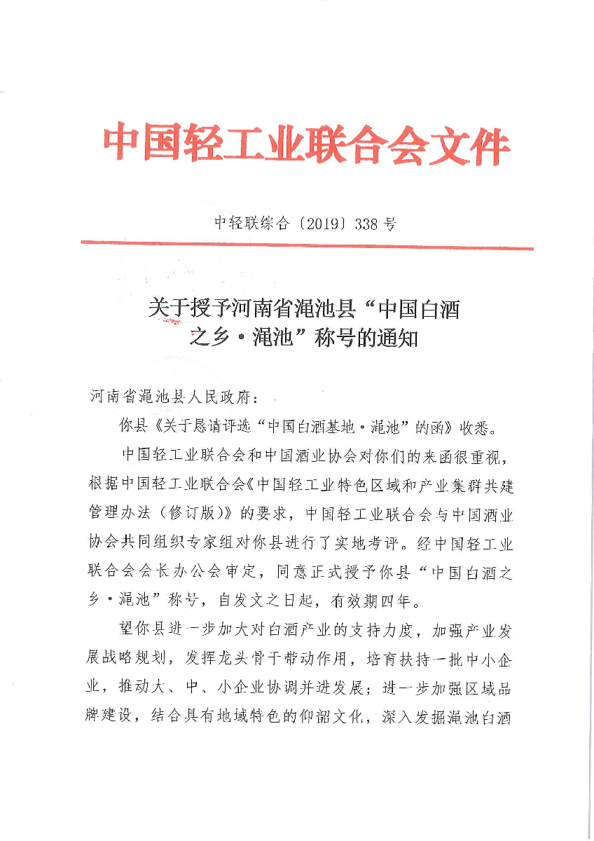 關于授予河南省澠池縣“中國白酒之鄉(xiāng)·澠池”稱號的通知