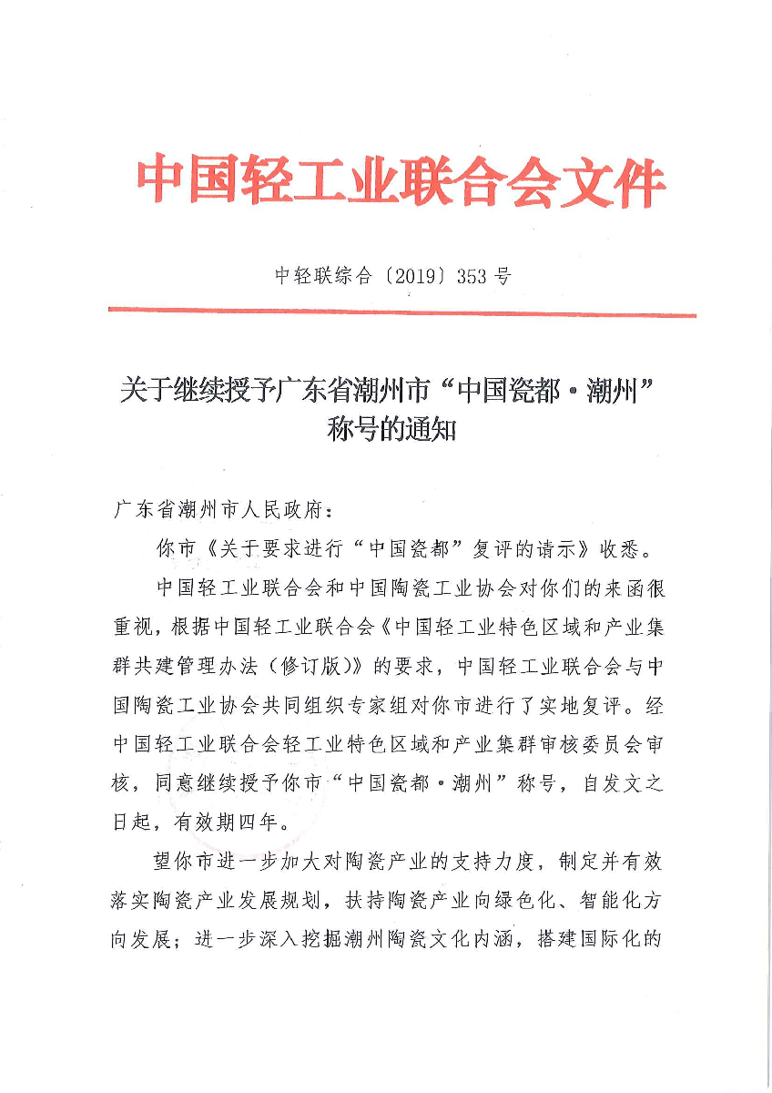 關(guān)于繼續(xù)授予廣東省潮州市“中國(guó)瓷都·潮州”稱號(hào)的通知