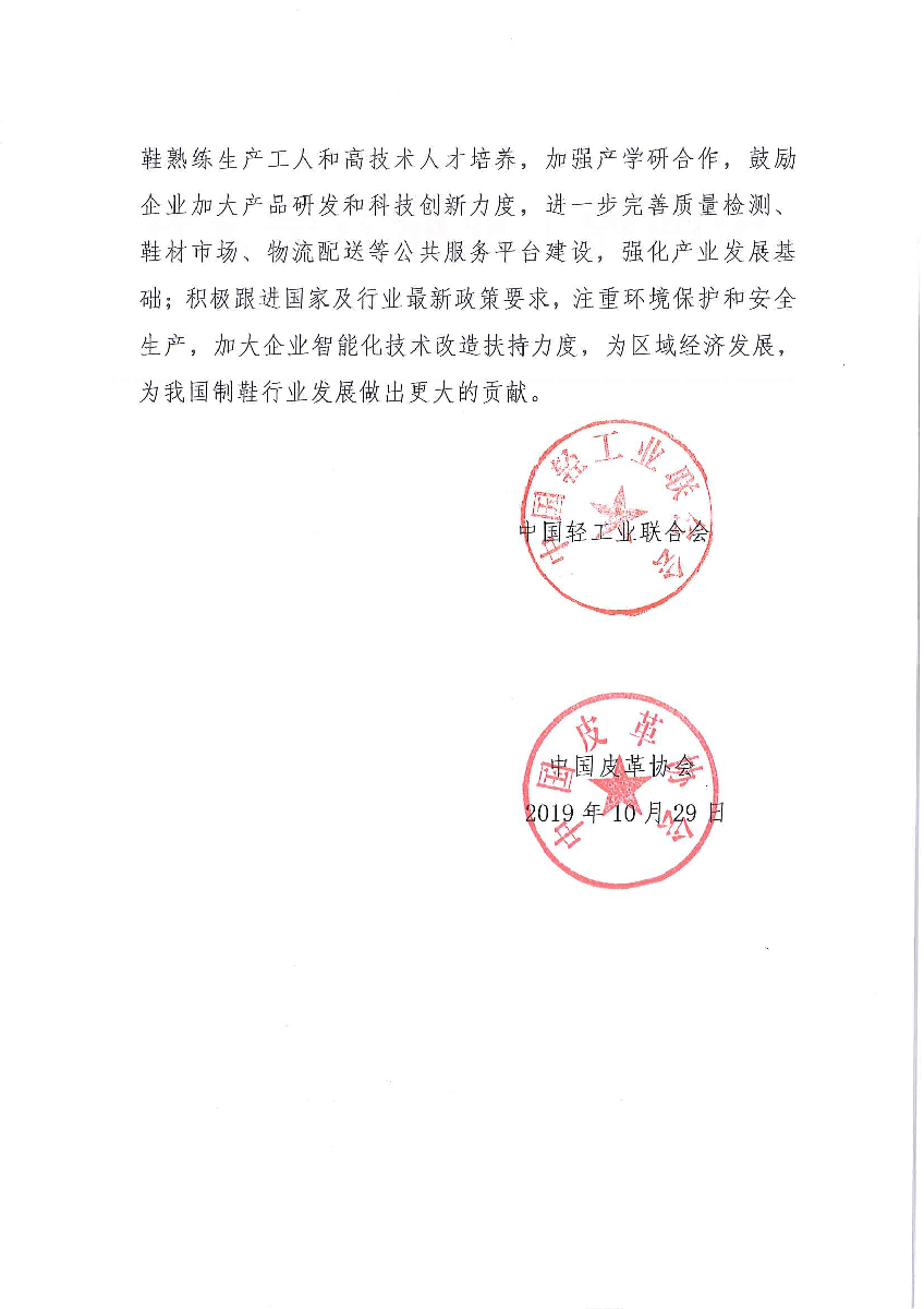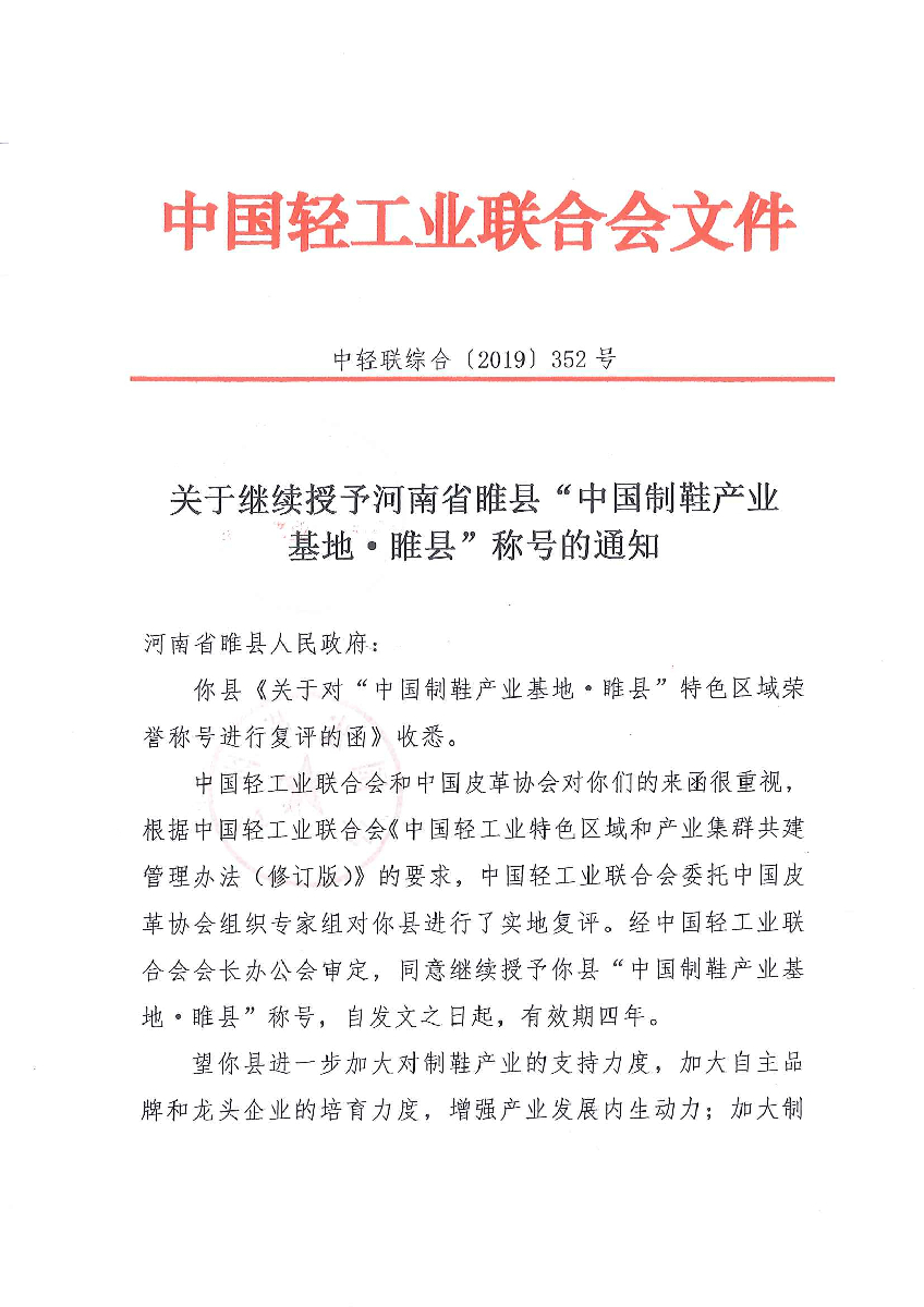 關(guān)于繼續(xù)授予河南省睢縣“中國制鞋產(chǎn)業(yè)基地·睢縣”稱號的通知