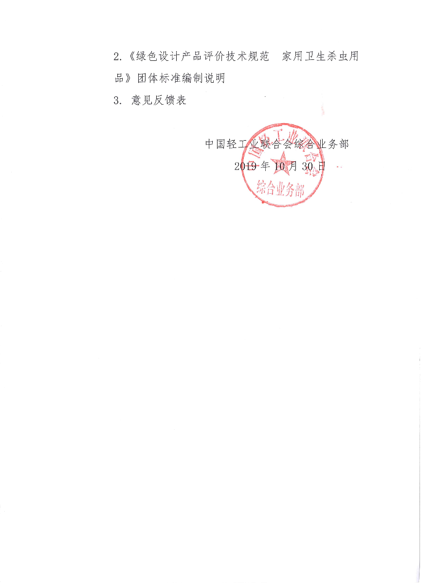 關(guān)于征求《綠色設(shè)計產(chǎn)品評價技術(shù)規(guī)范 家用衛(wèi)生殺蟲用品》中國輕工業(yè)聯(lián)合會團體標準(征求意見稿)意見的通知
