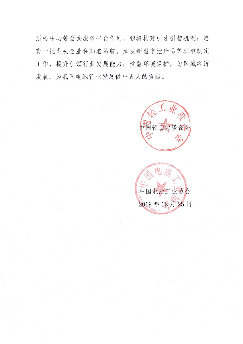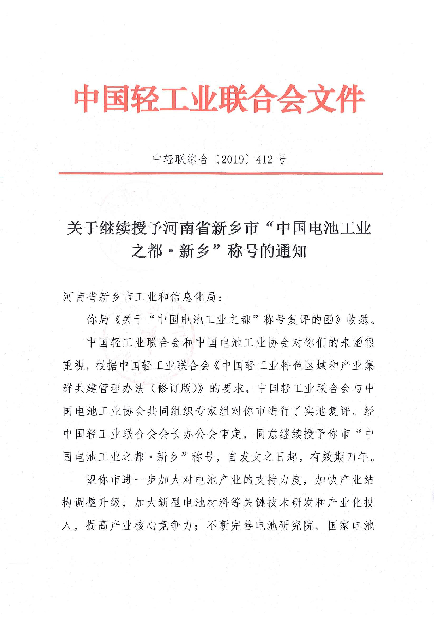 關(guān)于繼續(xù)授予河南省新鄉(xiāng)市“中國電池工業(yè)之都·新鄉(xiāng)”稱號的通知